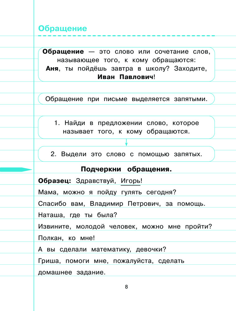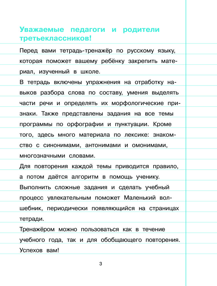 Тетрадь-тренажер. Русский язык. 3-й классВ данный момент этот товар отсутствует в продаже. Возможно, у нас найдется аналогичный или похожий товар здесь. Серия: Тетрадь-тренажер для начальной школы (обложка) Основная задача пособия, соответствующего ФГОС, закрепить полученные в школе знания по основным темам русского языка: типы текстов; виды предложений по цели высказывания и по интонации; обращение; главные и второстепенные члены предложения; знаки препинания в сложных предложениях; однозначные и многозначные слова; синонимы, антонимы, омонимы, фразеологизмы; Ь как показатель мягкости; разделительный Ь и Ъ; Ь после шипящих; неизменяемые существительные; правописание безударных гласных и парных по глухости и звонкости согласных в разных частях слова, слов с двумя безударными гласными в корне, непроизносимых согласных в корне, удвоенных согласных; суффиксов -ек, -ик, -ок, приставок и предлогов, сложных прилагательных и т. д. |