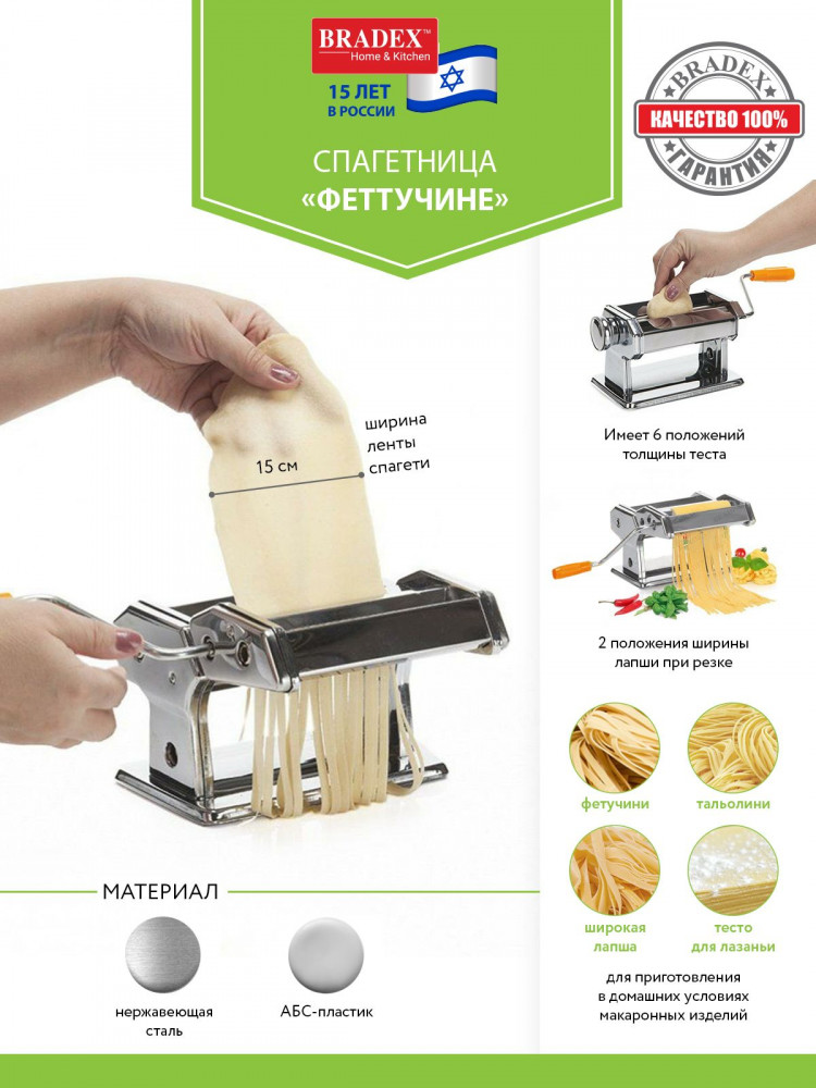 Bradex Лапшерезка «Футтучине»В данный момент этот товар отсутствует в продаже. Возможно, у нас найдется аналогичный или похожий товар здесь. Если Вы являетесь поклонником итальянской кухни, то с помощью уникального приспособления, спагетницы «Футтучине» Вы легко сможете приготовить в домашних условиях настоящие спагетти и не только, которые будут отличаться от покупных не только оригинальным вкусом и качеством, а также сохранением при приготовлении всех полезных веществ и микроэлементов. С помощью приспособления «Футтучине» Вы сможете раскатать тонко тесто, не тратя на это много усилий, а потом нарезать ровные аккуратные макаронные изделия. |