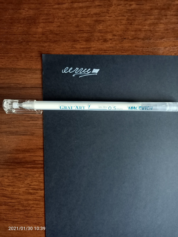 Согласна с предыдущими комментариями, после высыхания светлеет, слегка молочный оттенок, поверх капиллярной ручки малевич и поверх простой гелевой мажется, то есть смешивается и получается серый цвет, по просохшим черным, иногда просто перестает писать, чищу носик, опять расписываю на другой бумаге, но с горем пополам пишет.