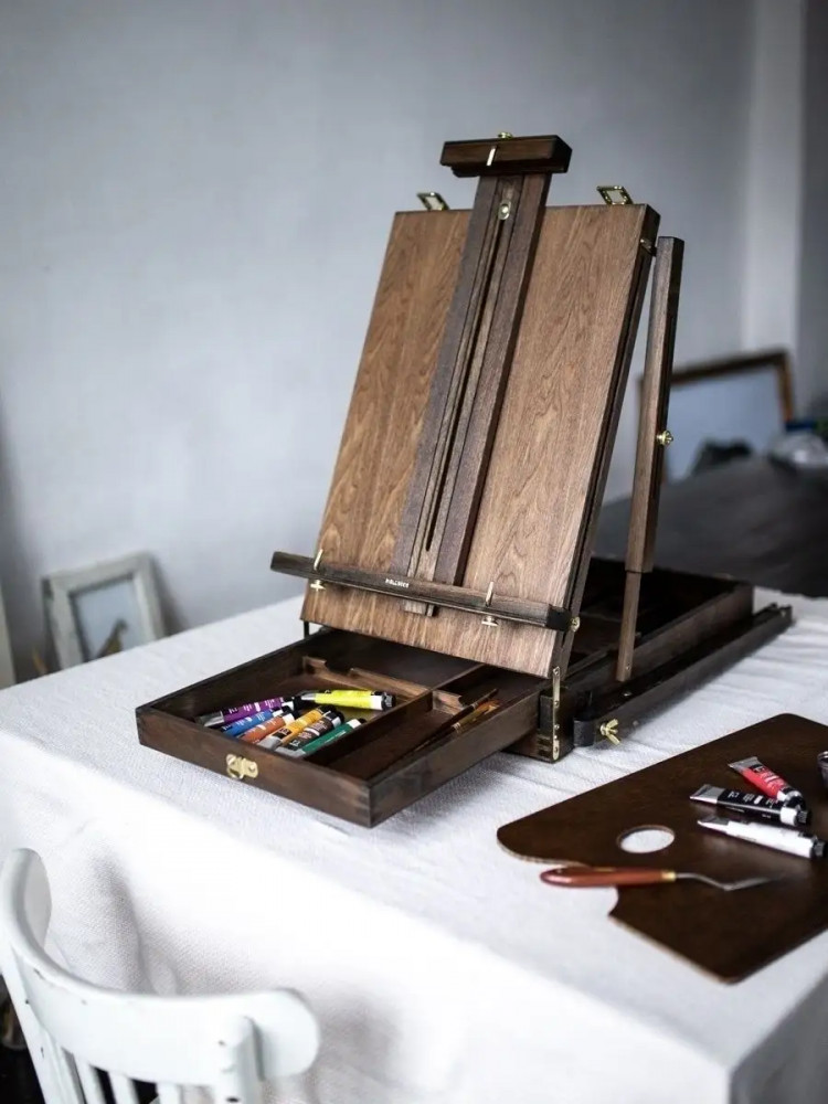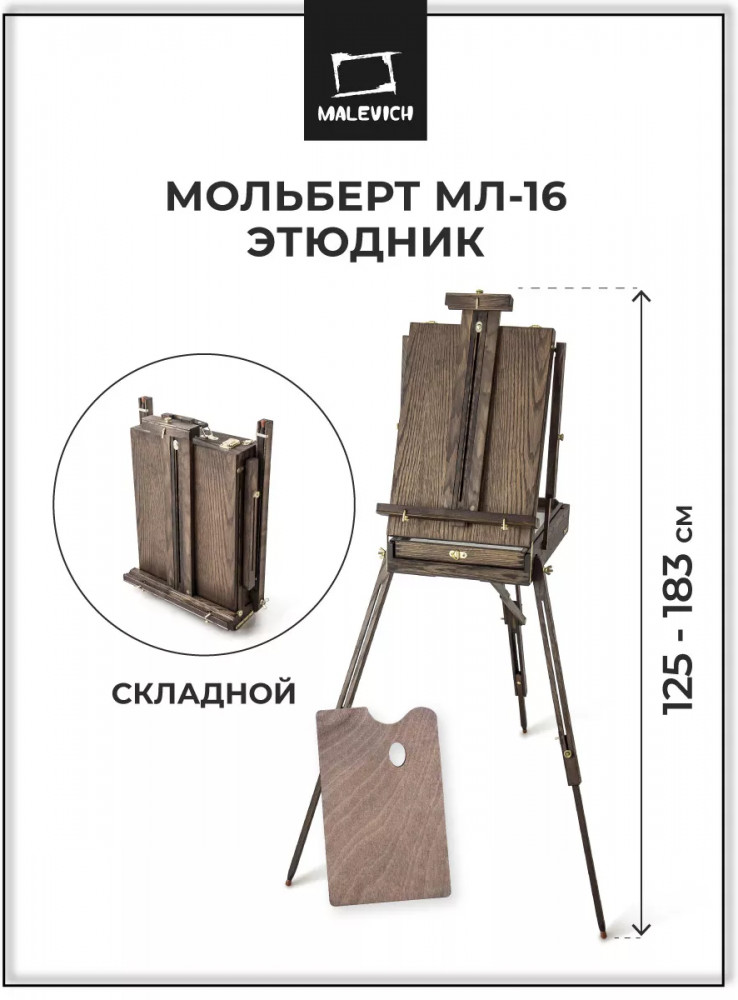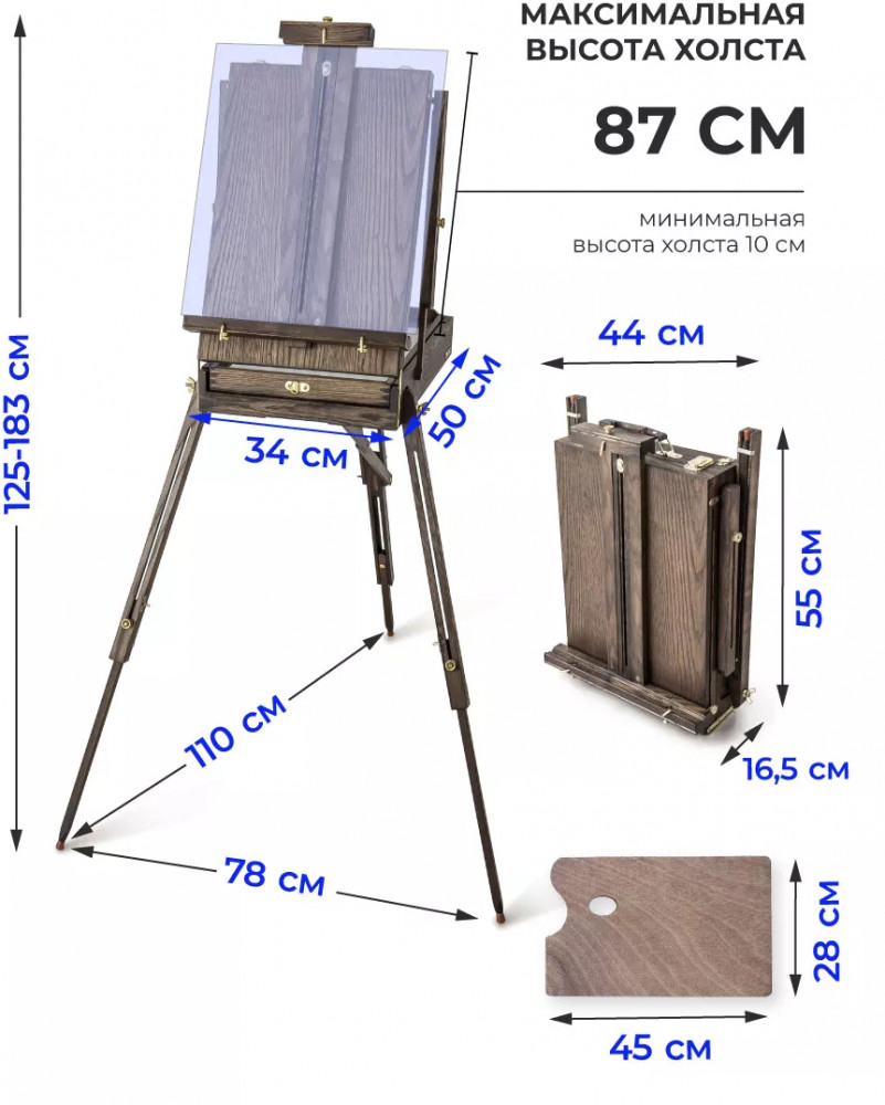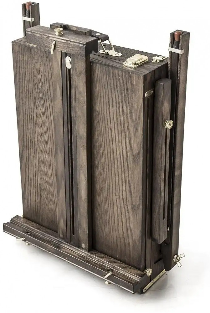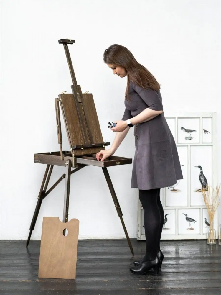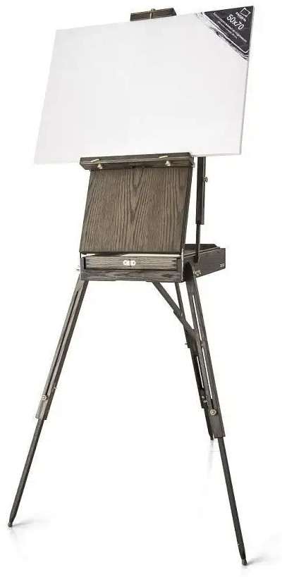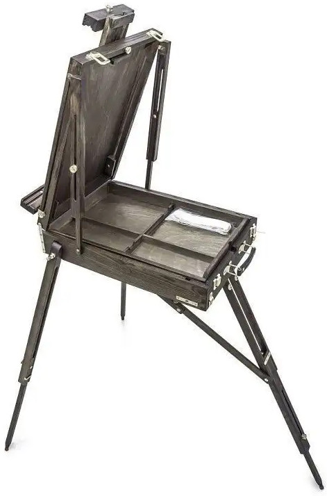 В просторном внутреннем ящике этюдника можно хранить кисти, краски и другие необходимые принадлежности. На время работы ящик можно выдвинуть, разместив на нем входящую в комплект палитру. В сложенном виде этюдник представляет собой компактный ящик с ручкой и ремешком для ношения на плече. Высота — 140-180 см, ширина полки для холста — 37 см, максимальная высота холста — 85 см, ниша для подрамника — 2 см.