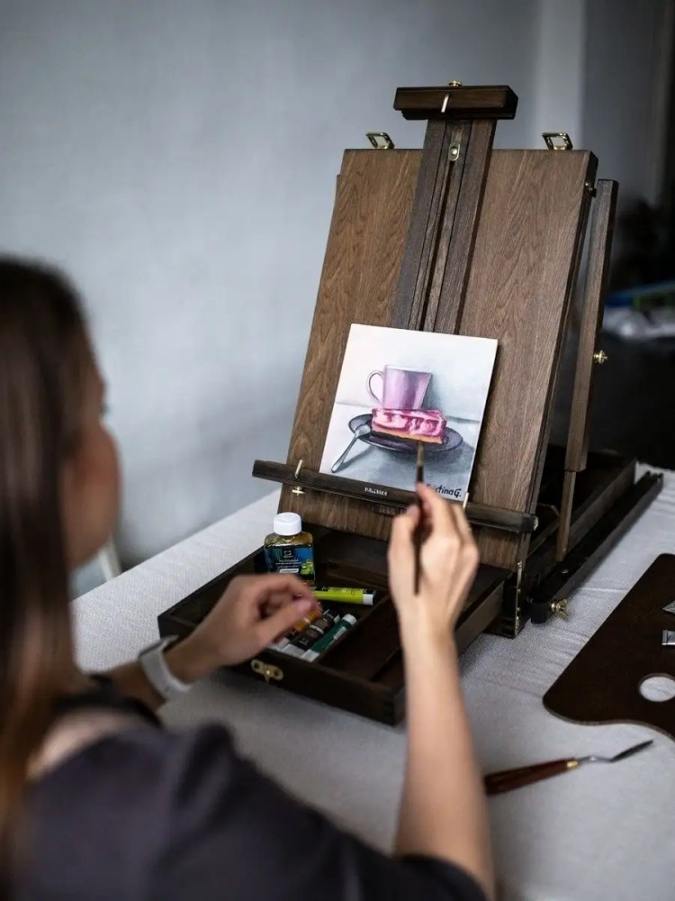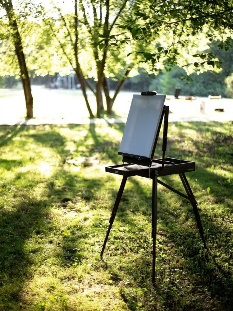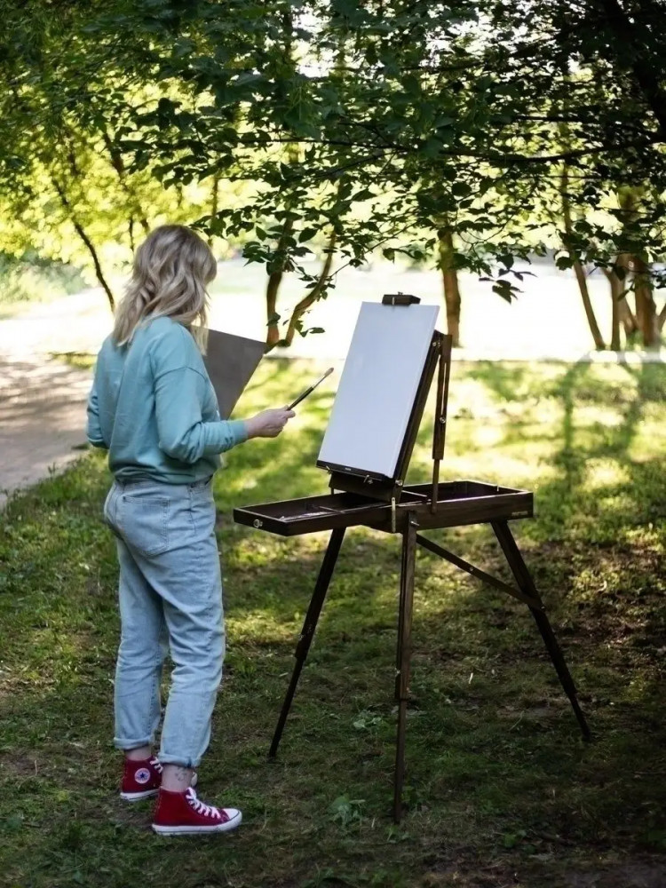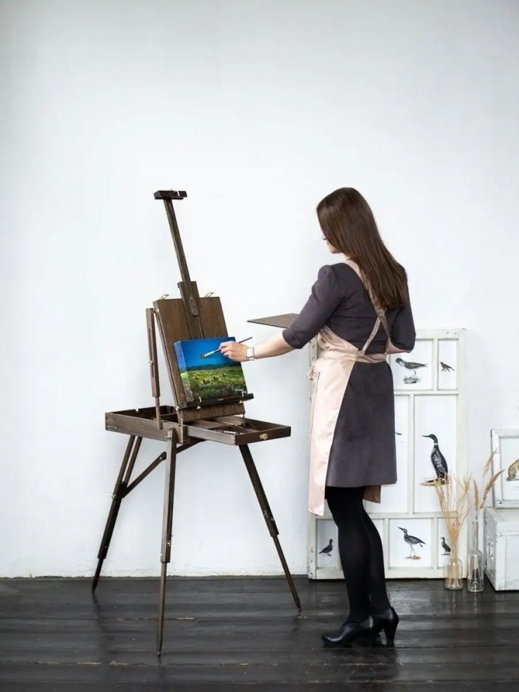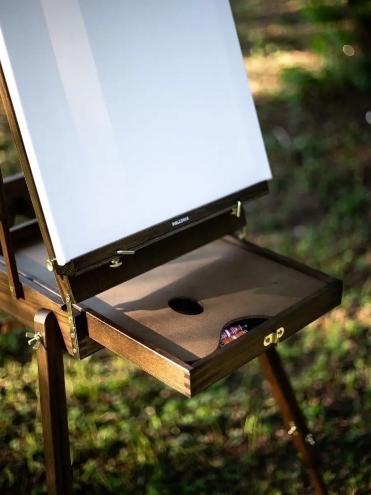 В просторном внутреннем ящике этюдника можно хранить кисти, краски и другие необходимые принадлежности. На время работы ящик можно выдвинуть, разместив на нем входящую в комплект палитру. В сложенном виде этюдник представляет собой компактный ящик с ручкой и ремешком для ношения на плече. Высота — 140-180 см, ширина полки для холста — 37 см, максимальная высота холста — 85 см, ниша для подрамника — 2 см.