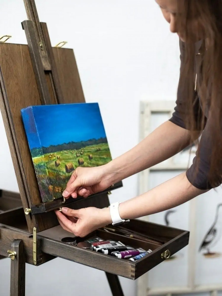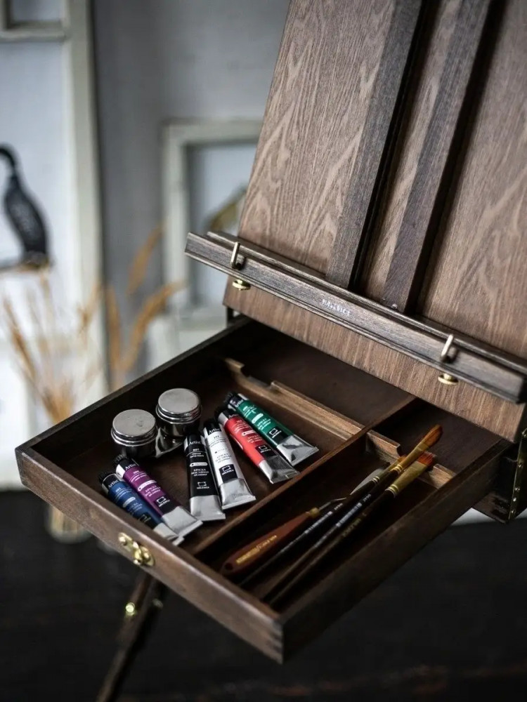 Этюдный ящик «Винтаж» МЛ-16 из вяза во французском стиле (с креплением холста на обратной стороне доски). Древесина вяза очень трудна для обработки, поэтому из нее делают только эксклюзивные изделия, требующие особенной прочности. Еще одной особенностью этого материала является ярко выраженный «деревянный» рисунок поверхности. Для придания эффекта старения ящик покрыт специальным составом, благодаря которому древесина приобретает интересный серо-зеленый оттенок. Крепления и фурнитура этюдника выполнены из устойчивого к коррозии металлического сплава красивого золотистого цвета.