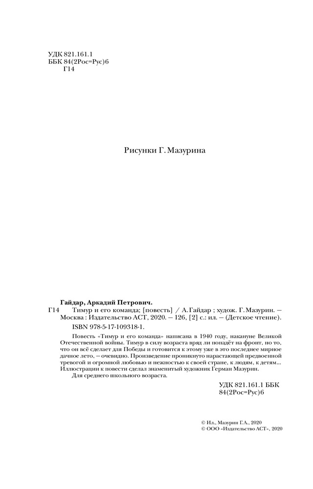 💳 Оплатить за товар можно при получении 🇰🇿 Есть бесплатная доставка по Казахстану от 1 дня 🎁 Копите бонусы с каждой покупки Серия: Детское чтение Повесть «Тимур и его команда» написана в 1940 году, накануне Великой Отечественной войны. Тимур в силу возраста вряд ли попадёт на фронт, но то, что он всё сделает для Победы и готовится к этому уже в это последнее мирное дачное лето, — очевидно. Произведение проникнуто нарастающей предвоенной тревогой и огромной любовью и нежностью к своей стране, к людям, к детям... Иллюстрации к повести сделал знаменитый художник Герман Мазурин. |