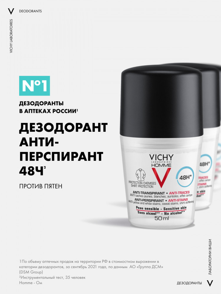 Vichy Homme Дезодорант-антиперспирант защита от пятен 48 часовВ данный момент этот товар отсутствует в продаже. Возможно, у нас найдется аналогичный или похожий товар здесь. Мужской шариковый ДезодорантАнтиперспирант 48 часов* против пятен обеспечивает надежную защиту от белых, желтых пятен и следов пота на одежде, а также предотвращает изменение фактуры ткани. Имеет свежий аромат с нотами лайма, кориандра, кедра, ветивера. Гипоаллергенно. Не содержит этиловый спирт, без парабенов. Протестировано под контролем дерматологов. |
