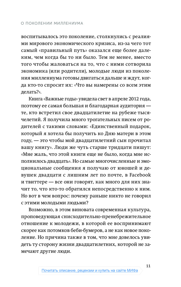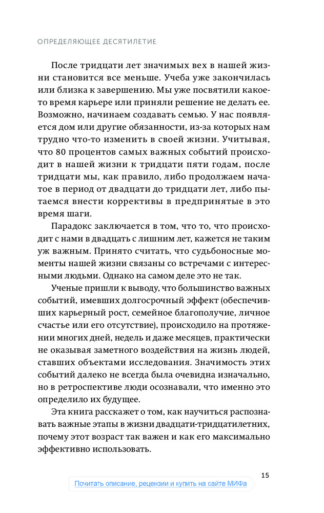 Важные годы. Почему не стоит откладывать жизнь на потомВ данный момент этот товар отсутствует в продаже. Возможно, у нас найдется аналогичный или похожий товар здесь. Серия: Личное развитие «Важные годы» — книга, которая может существенно повлиять на вашу дальнейшую жизнь или на жизнь вашего ребенка. Кто-то называет годы с двадцатого по тридцатый второй молодостью, кто-то — началом взрослой жизни. Доктор Мэг Джей, клинический психолог, утверждает, что это самое важное десятилетие в жизни человека с точки зрения развития важных сфер жизни: работы, любви, физического и интеллектуального развития. |