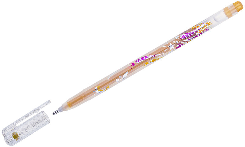 очень нарядная прозрачная ручка с яркими блестящими рисунками на корпусе и сверкающим блесками стержнем
