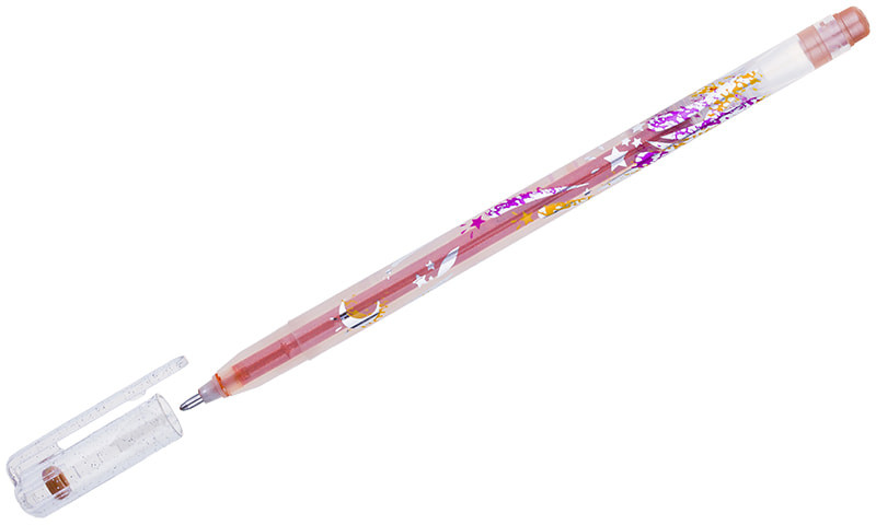 очень нарядная прозрачная ручка с яркими блестящими рисунками на корпусе и сверкающим блесками стержнем