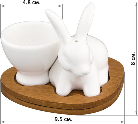 💳 Оплатить за товар можно при получении 🇰🇿 Есть бесплатная доставка по Казахстану от 1 дня 🎁 Копите бонусы с каждой покупки Поставка под яйцо с солонкой в виде зайчика на деревянной подставке — прекрасный пример высококачественной, удобной и лаконичной посуды для изящной сервировки стола. Подставка под яйцо и солонка выполнены из прочного белого фарфора, а подставка из бамбука. Наполнить емкость для специй можно через отверстие в донышке, которое надежно закрывается пластиковой пробкой. |