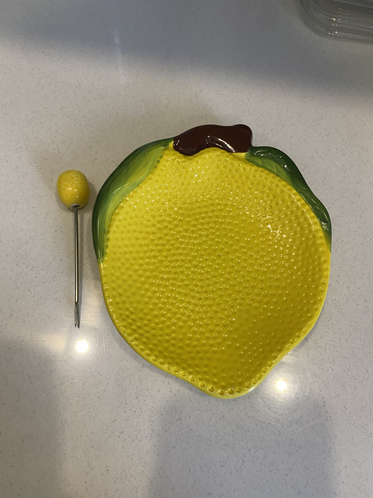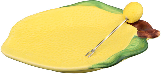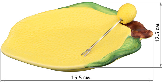 Неплохая тарелочка, вместительная на целый лимон. А вот вилочка сделана небрежно. Неровно вставлена в держатель. За это снимаю звезду.