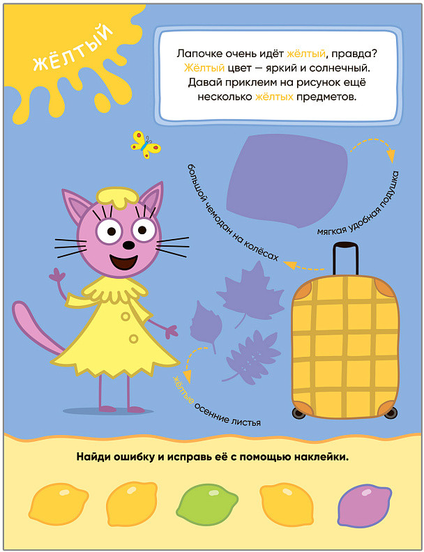 Книга «Цвета» серии «Три кота. Учимся с котятами» — это не только увлекательная книга с наклейками, но и отличный способ закрепить знания, развить мелкую моторику, логику и внимание. Вместе с тремя котятами ребенок познакомится с основными цветами: красным, желтым, зеленым, синим и оранжевым. На каждой странице его ждут задания на изучение того или иного цвета. Внизу страницы — забавные нелепицы, в которых нужно исправить ошибку. |