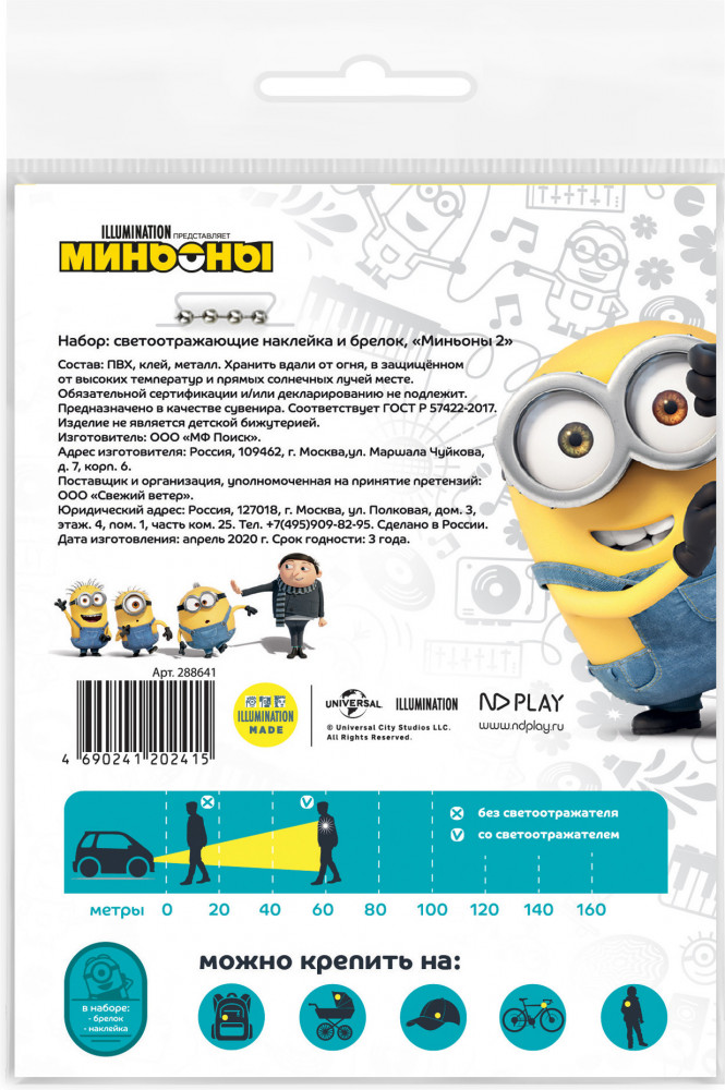 ND Play Набор светоотражателей: наклейка и брелокВ данный момент этот товар отсутствует в продаже. Возможно, у нас найдется аналогичный или похожий товар здесь. Серия: Миньоны Наклейки со световозвращающей поверхностью часто используют для оформления верхней и детской одежды, а также рюкзаков. Наклейка прочно фиксируется и не теряется при ношении. Наклейка и брелок светоотражающие улучшают видимость в темное время суток. |