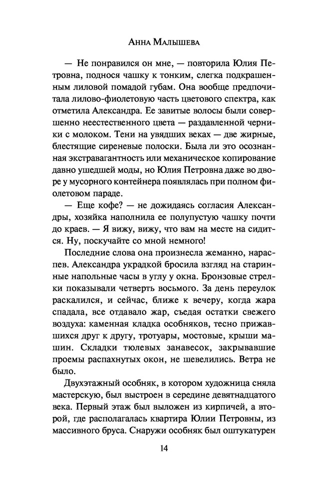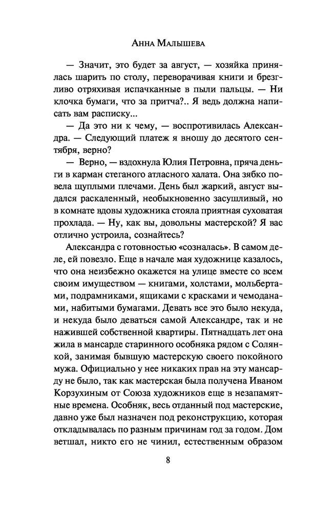 | Анна Малышева окончила Литературный институт имени А.М. Горького. С 1996 года издает любовно-детективные романы, которые сразу получили горячее признание широкой читательской аудитории.
