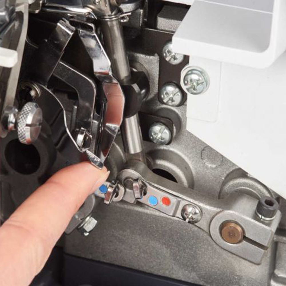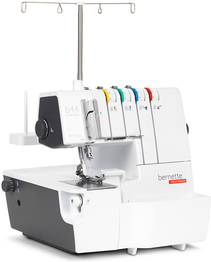 Следуя цветным направителям, осуществить заправку нитей на машине bernette Funlock 44 очень просто. Отдельный нитевдеватель и механизм заправки петлителя также упрощают процесс заправки.