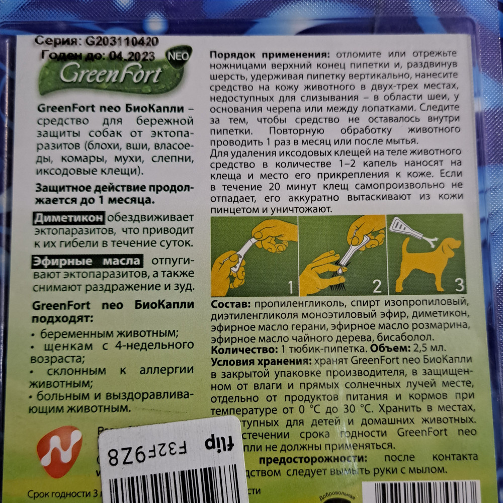 GreenFort Neo БиоКапли для собак более 25 кгВ данный момент этот товар отсутствует в продаже. Возможно, у нас найдется аналогичный или похожий товар здесь. GreenFort neo БиоКапли — средство для бережной защиты собак от эктопаразитов (клещей, блох, власоедов, комаров, мух, слепней). Защитное действие продолжается до 1 месяца, в зависимости от условий содержания. Диметикон обездвиживает эктопаразитов, что приводит к их гибели в течение суток. Эфирные масла, входящие в состав, отпугивают эктопаразитов, а также снимают раздражение и зуд. В упаковке 1 тюбик-пипетка. |