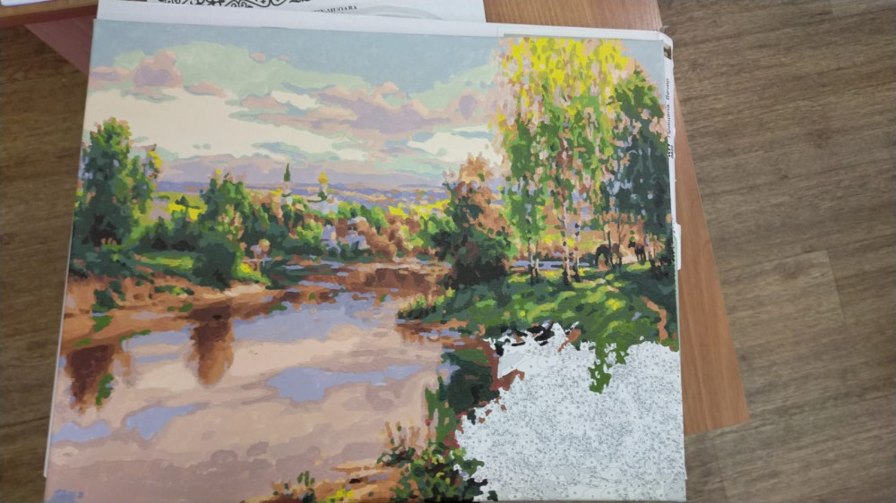 Начала процесс... Все пришло в целости и сохранности. Краски и кисти отличное. Благодарим за отличный товар!