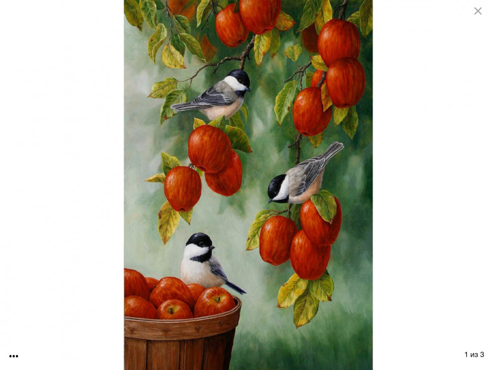 Цвета красок не соответствуют цветам картины. Яблоки получаются коричневыми, но не красными. Синички не с белым брюшком, а салатового цвета.