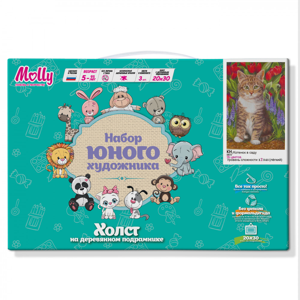 Molly Набор юного художника «Котёнок в саду»В данный момент этот товар отсутствует в продаже. Возможно, у нас найдется аналогичный или похожий товар здесь. Используя кисти и краски, на холсте из натурального хлопка можно нарисовать милого котенка в саду. |