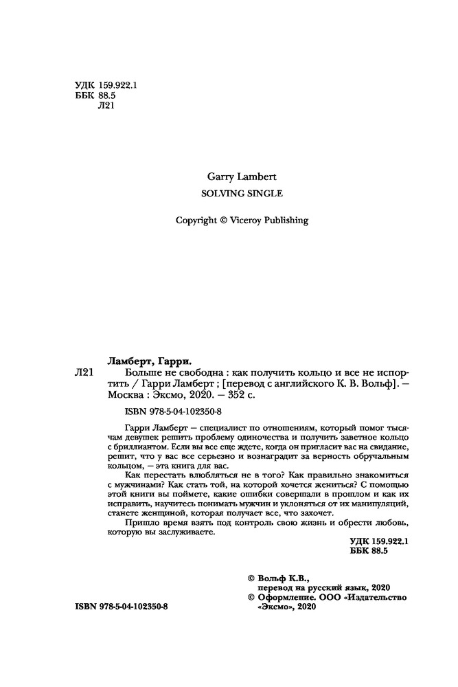 Больше не свободна. Как получить кольцо и все не испортитьВ данный момент этот товар отсутствует в продаже. Возможно, у нас найдется аналогичный или похожий товар здесь. Серия: Психология. М & Ж Гарри Ламберт — ?специалист по отношениям, который помог тысячам девушек решить проблему одиночества и получить заветное кольцо с бриллиантом. Если вы все еще ждете, когда он пригласит вас на свидание, решит, что у вас все серьезно и вознаградит за верность обручальным кольцом, — ?эта книга для вас. Как перестать влюбляться не в того? Как правильно знакомиться с мужчинами? Как стать той, на которой хочется жениться? С помощью этой книги вы поймете, какие ошибки совершали в прошлом и как их исправить, научитесь понимать мужчин и уклоняться от их манипуляций, станете женщиной, которая получает все, что захочет. Пришло время взять под контроль свою жизнь и обрести любовь, которую вы заслуживаете. |