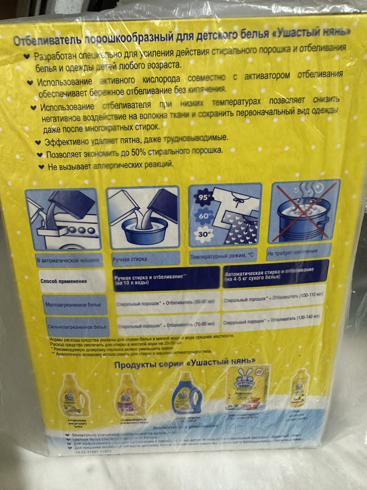 💳 Оплатить за товар можно при получении 🇰🇿 Есть бесплатная доставка по Казахстану от 1 дня 🎁 Копите бонусы с каждой покупки Отбеливатель для детского белья «Ушастый нянь» разработан специально для усиления действия стирального порошка и отбеливания белья и одежды детей любого возраста, в том числе и новорожденных. Использование активного кислорода совместно с активатором отбеливания обеспечивает бережное отбеливание без кипячения. Использование отбеливателя при низких температурах позволяет снизить негативное воздействие на волокна ткани и сохранить первоначальный вид одежды даже после многократных стирок. Эффективно удаляет пятна, даже трудновыводимые. Позволяет экономить до 50 процентов стирального порошка. Гипоаллергенность средства доказана. Применение для ручной и автоматической стирки. |