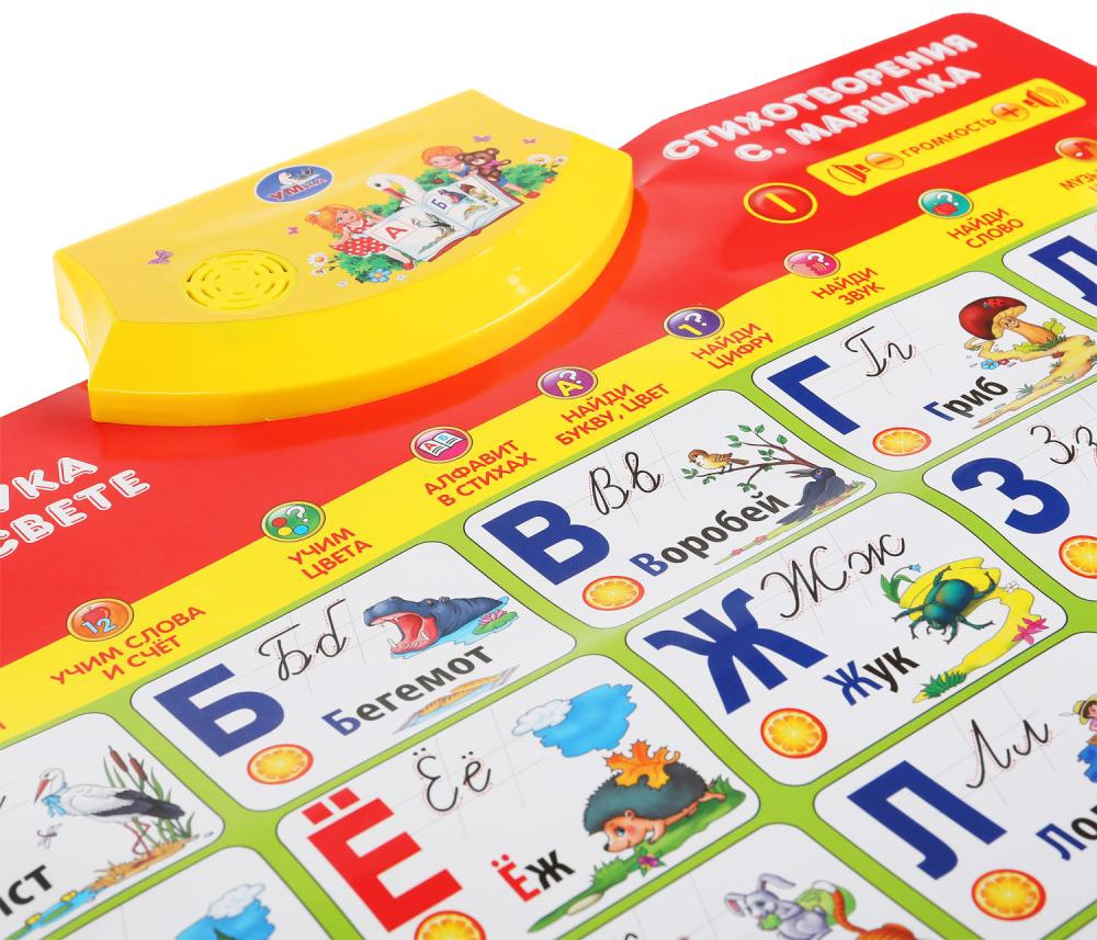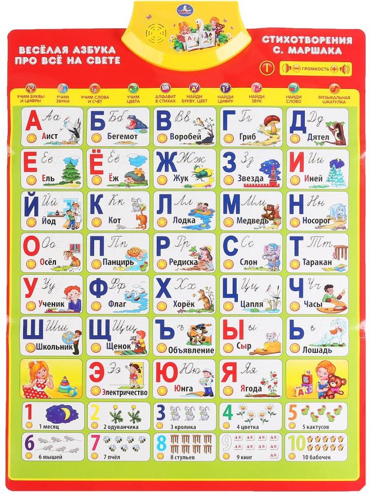 УМка Плакат говорящий «Азбука в стихах»В данный момент этот товар отсутствует в продаже. Возможно, у нас найдется аналогичный или похожий товар здесь. Говорящий плакат «Азбука в стихах. С.Маршак» ТМ «УМка» порадует вашего ребенка красочным дизайном и своим функционалом. Полезная «база» для обучения ребёнка в виде обучающего плаката. Преподнесённую в визуальном формате информацию ребёнку будет проще усвоить и запомнить. Плакат ТМ «УМка» поможет малышу выучить алфавит и цифры, цвета и формы, а также способствует развитию памяти, внимания, визуального и слухового восприятия и речи. |