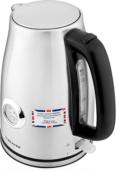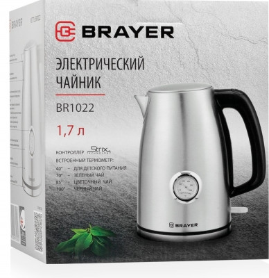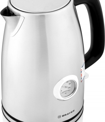 Brayer BR1022 — стильный и надёжный электрочайник с корпусом из нержавеющей стали и металлическим фильтром, не дающим накипи попадать в чашки. Его объём составляет 1,7 л, а нагревательный элемент мощностью 2200 Вт позволяет быстро получить горячую воду для чая, кофе и других напитков. Прибор оснащён встроенным аналоговым термометром, который придаёт ему винтажный облик. Благодаря этому вы легко узнаете актуальную температуру воды. Устройство прекращает работу в момент закипания или снятия с подставки, а также в том случае, если его резервуар пуст.