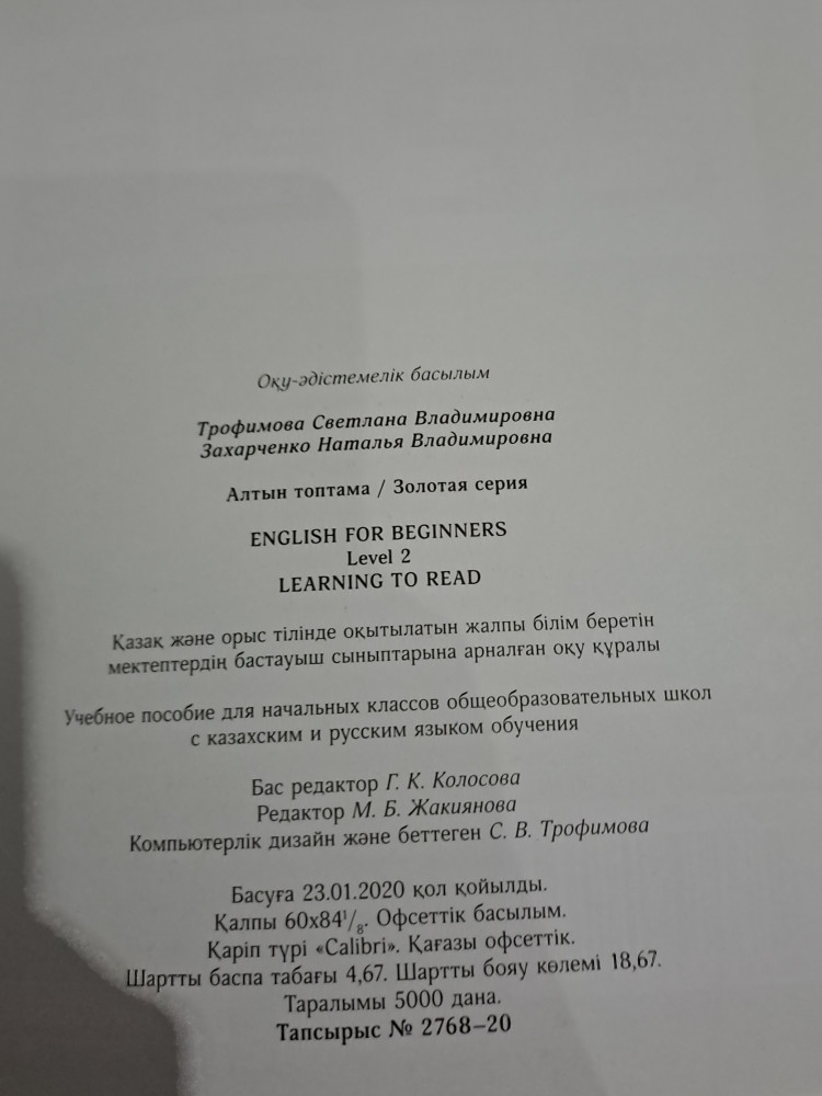 Серия: Золотая серия Бұл құрал «English for beginners» топтамасының 2-нші сатысы болып табылады және білім алушылардың ағылшын тілінде оқу дағдысын қалыптастыруға бағытталған. Бұл құралдың міндеттері: дауысты және дауыссыз әріптер мен дыбыстармен танысу; үйреніп отырған әріппен сөздерді оқу дағдысын қалыптастыру (әріптер мен оның тіркестерімен оқуға арналған кеңейтілген жағдайлар берілген); бұрын берілген сөздерді оқу қабілетін бекіту (қызыл сызықтың астында берілген). |