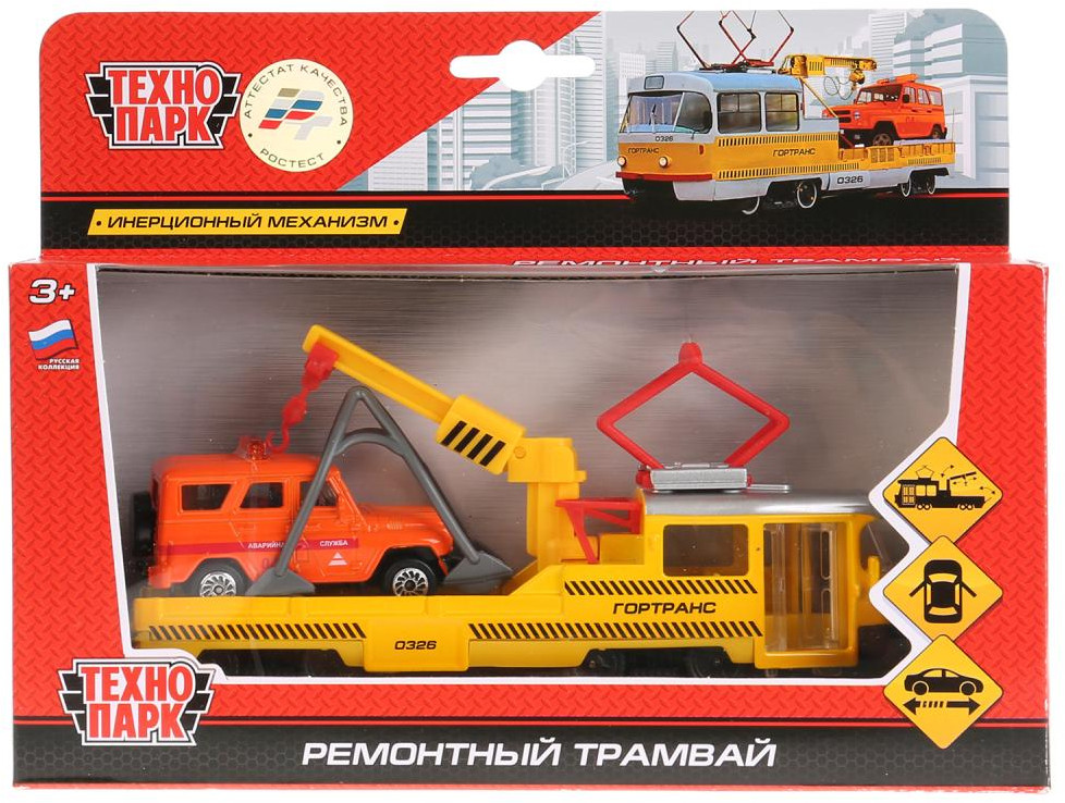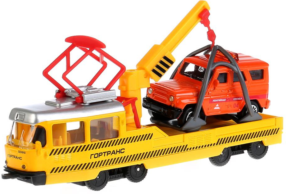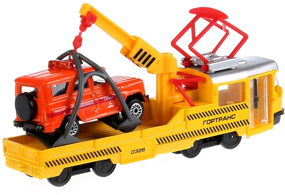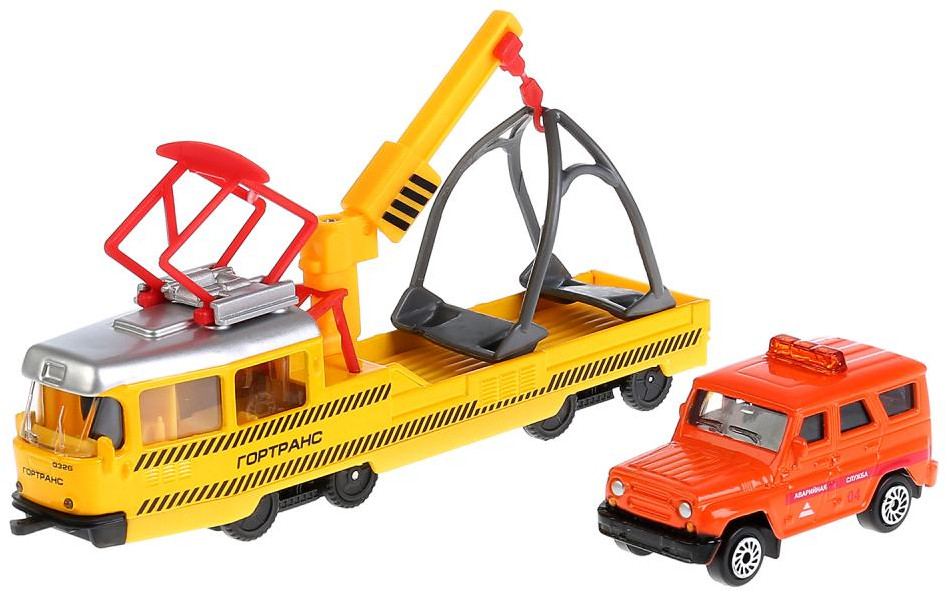 • в комплекте находятся модель автомобиля УАЗ Hunter, выполненная в дизайне машины аварийной службы, которую можно перевозить в кузове трамвая или играть им отдельно, расширяя игровые возможности;