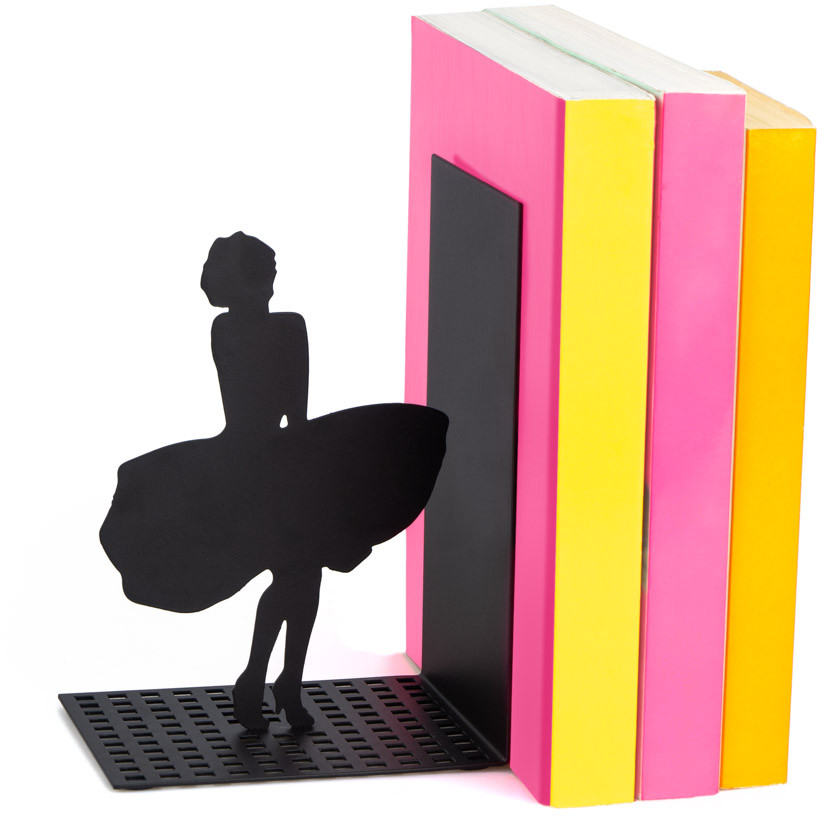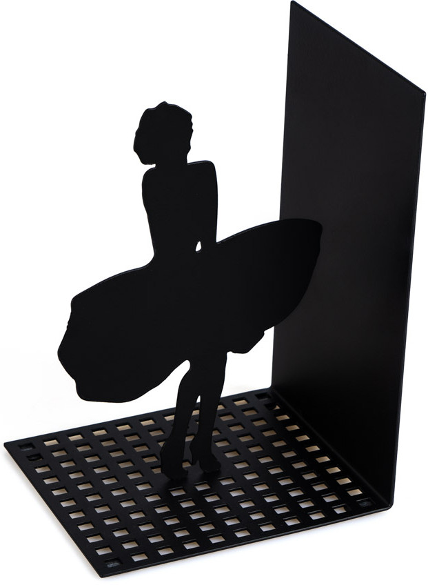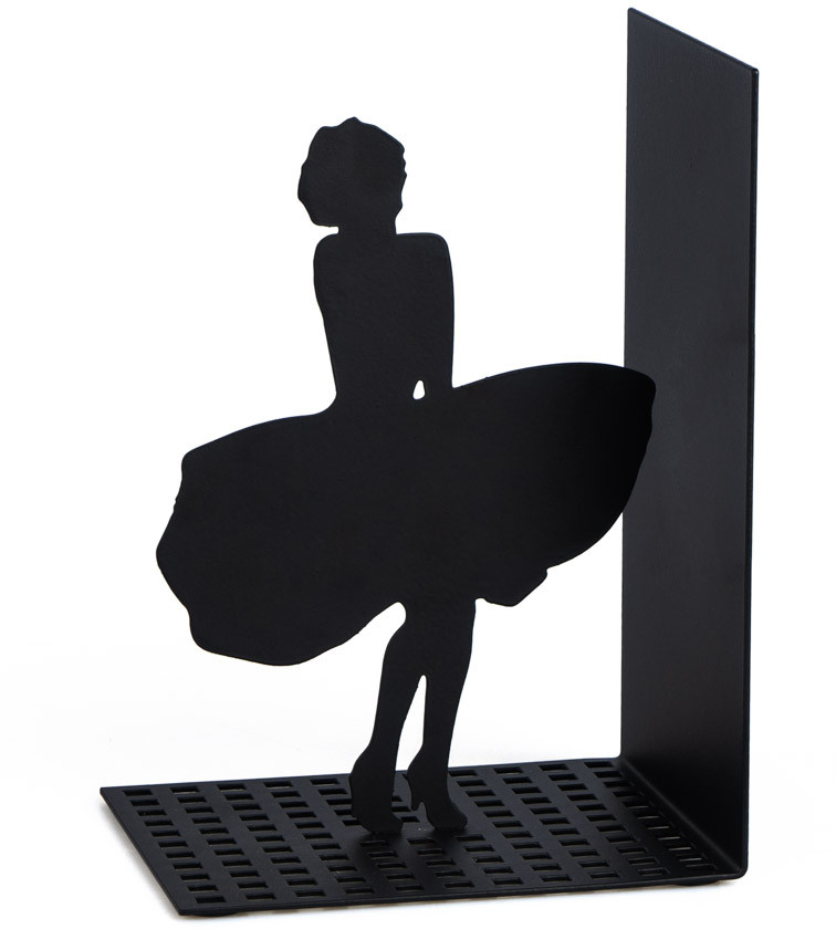 Металлический держатель покрыт черной краской. На нем изображена изящная фигурка Мерлин Монро, которая пытается удержать свое платье. Конструкция высокого качества отражает даже мелкие детали. Отличается прочностью. За ним легко ухаживать. Держатель надежно фиксирует книги, не позволяя им упасть.