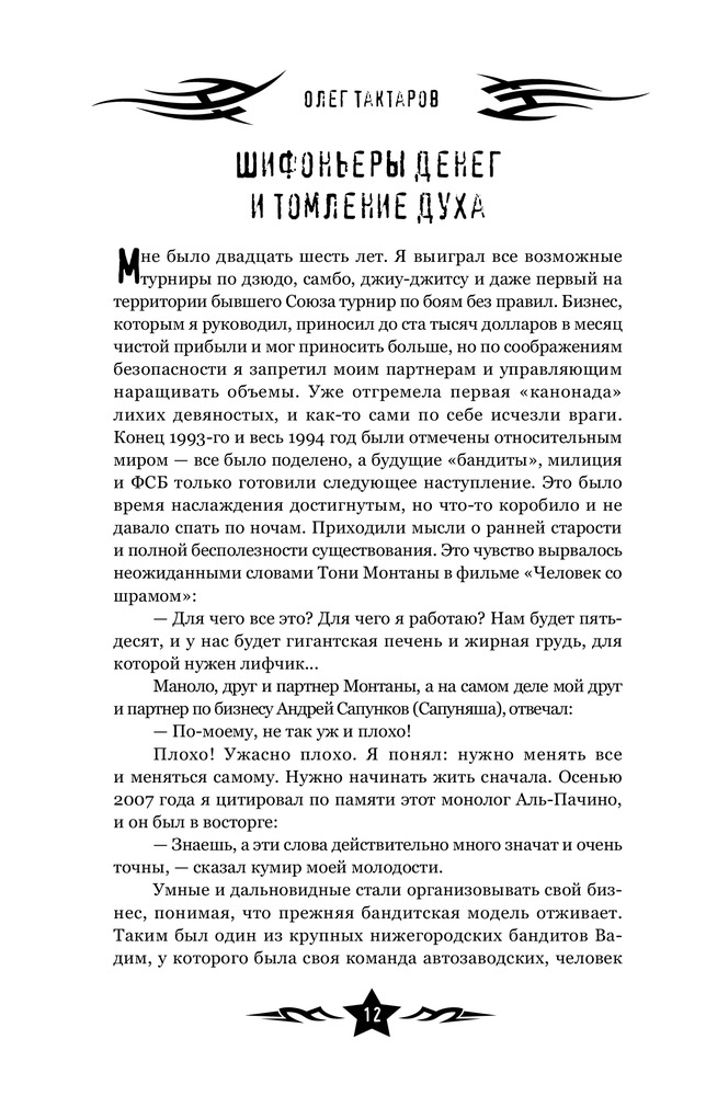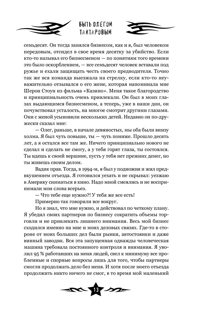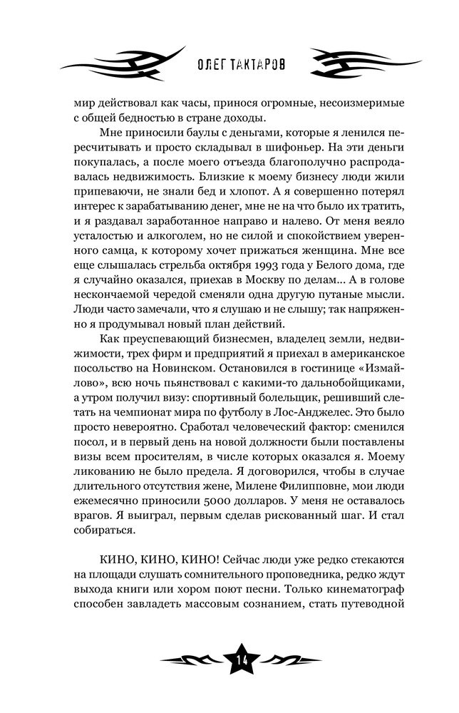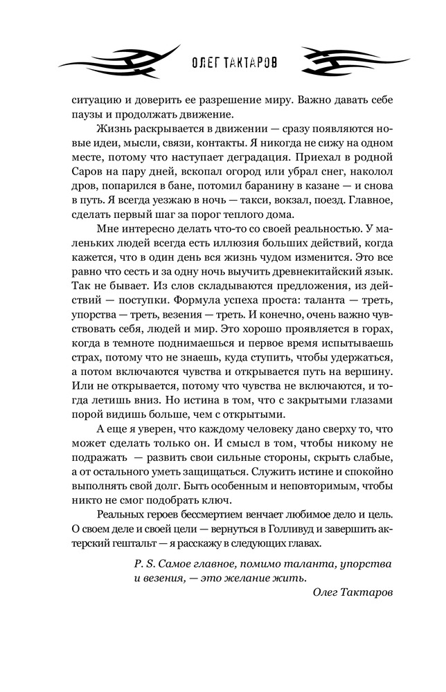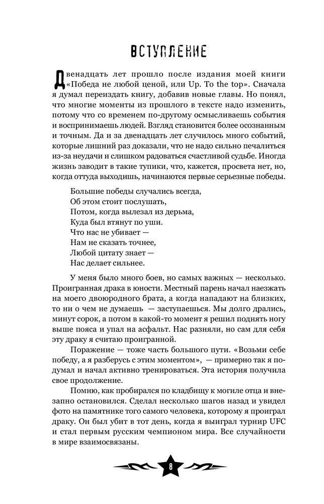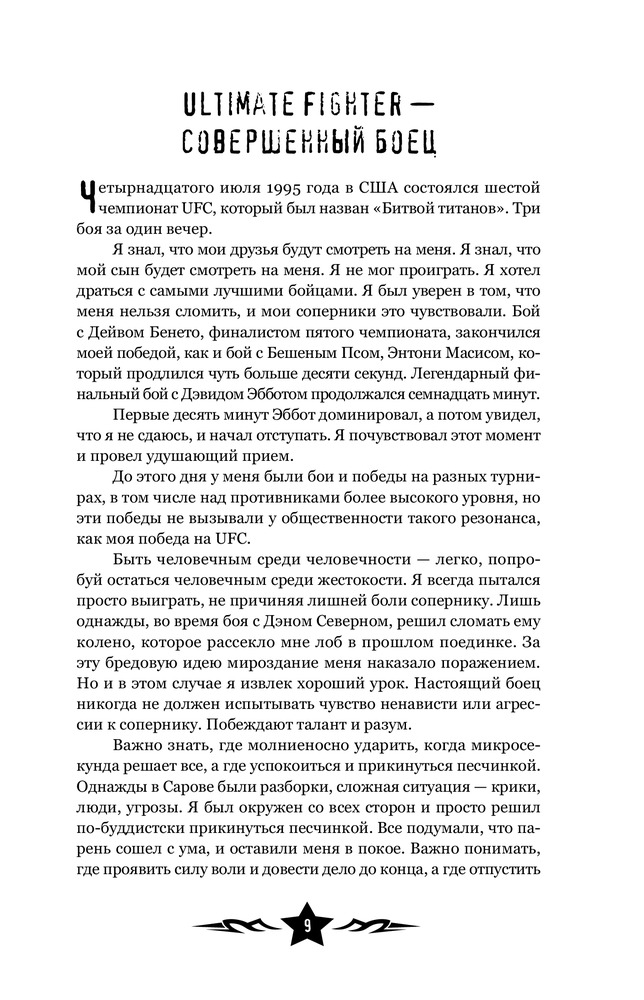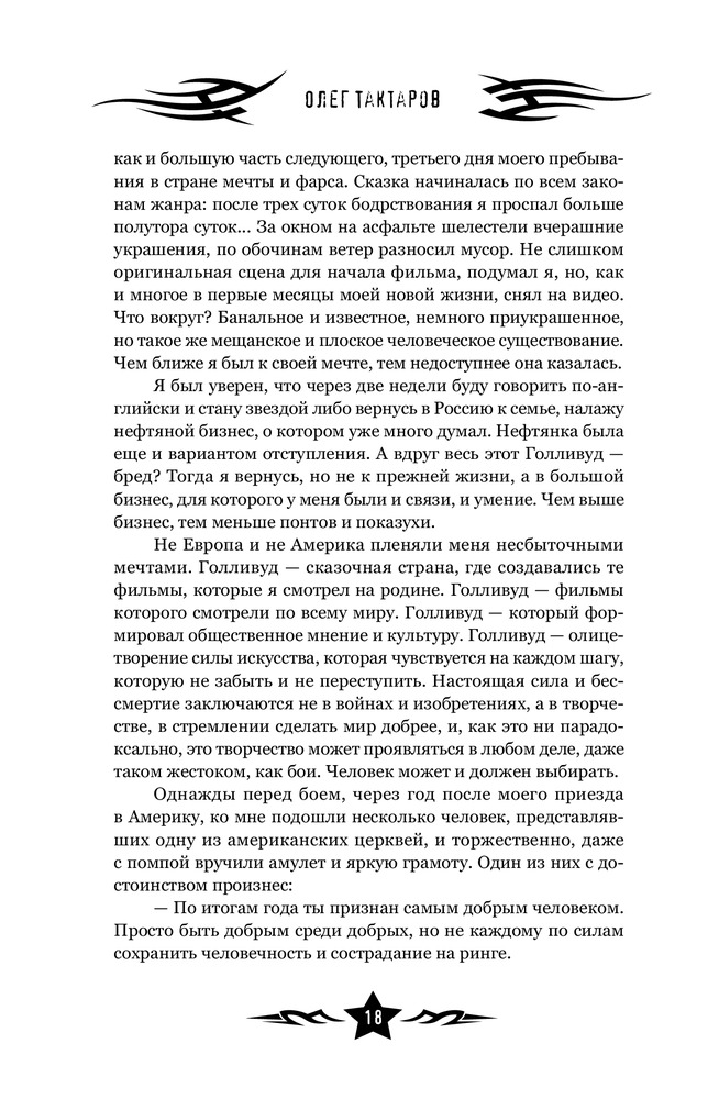 Быть Олегом ТактаровымВ данный момент этот товар отсутствует в продаже. Возможно, у нас найдется аналогичный или похожий товар здесь. Серия: Стать первым Чемпион — это не просто звание и история одной победы, это — Путь, образ жизни, мышления, действия. Первый чемпион UFC из России Олег Тактаров тренировался по 8 часов в день, оттачивая любимые приемы и создавая уникальные подготовки; выиграл множество турниров по дзюдо, самбо, джиу-джитсу; построил и наладил бизнес в сложное время. Но деньги, власть, местная слава стали неинтересны, он сел в самолет и улетел в Голливуд, чтобы воплотить свою мечту о кино. 14 июля 1995 года в США состоялся шестой чемпионат UFC, который был назван «Битва титанов». Олег Тактаров провел три боя за один вечер. Дрался без защиты, без перчаток, без ограничения времени, без весовых категорий, без употребления стероидов и добавок. Он победил достойно, не причинив лишней боли соперникам. Это и есть его главное кредо в бою. Автор рассказывает о Голливуде, об учебе в престижной актерской академии «Playhouse West», о съемках вместе с Робертом Де Ниро, Аль Пачино, Николасом Кейджем и другими мировыми звездами, про приключения в намибийской пустыне, где ему пришлось выживать вместе со съемочной группой 9 дней, и многом другом. Все самое интересное от рождения до сегодняшнего дня — в этой книге, написанной Олегом Тактаровым. |