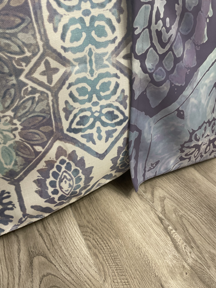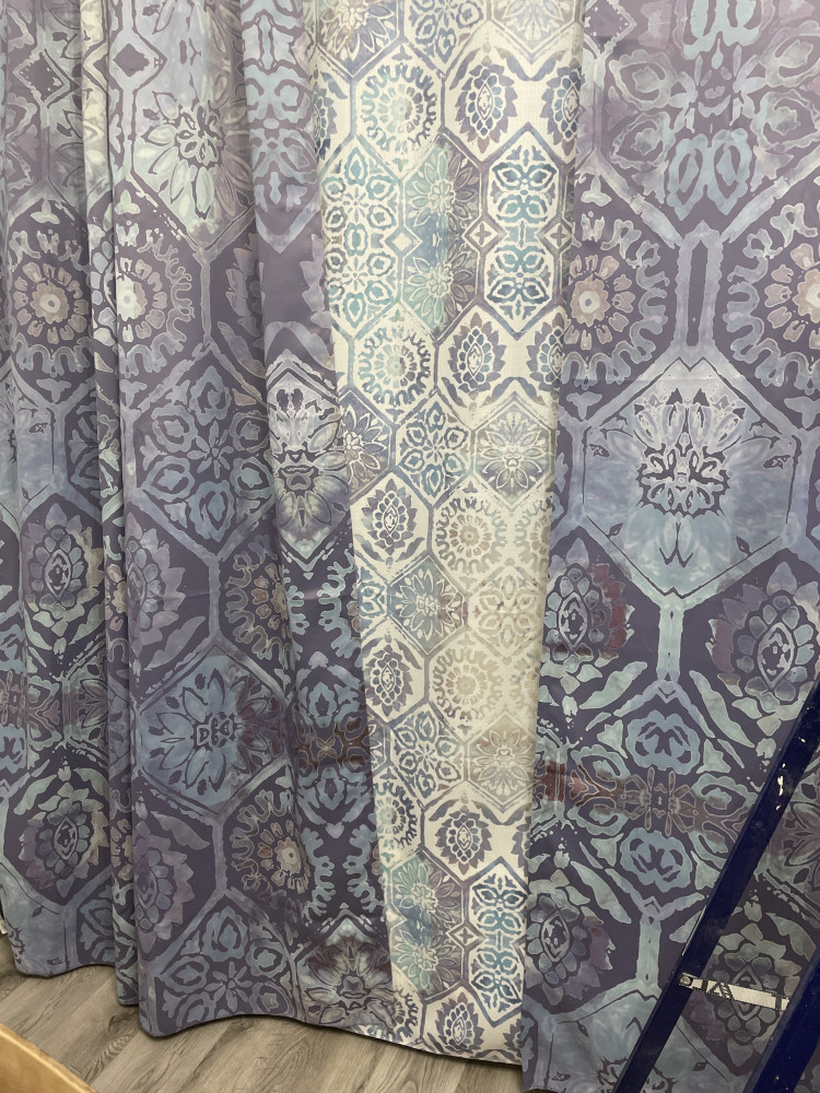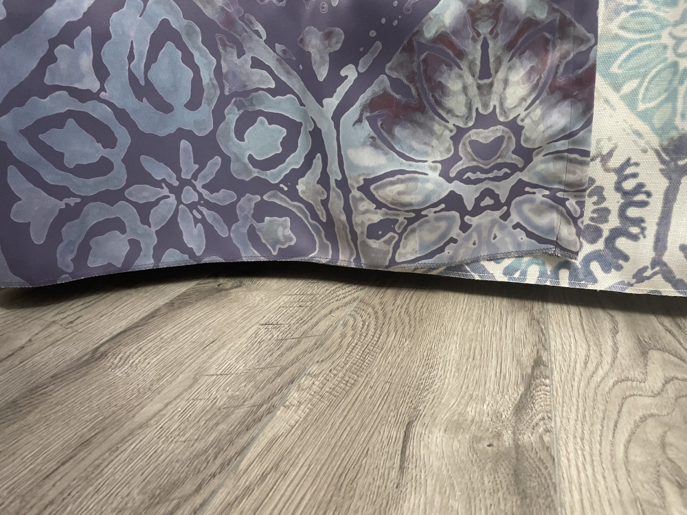 Очень красивая ткань но пошиты как попало, длине 270 не соответствуют, не хватает от 2 до 7 см, нижний край волной подрезан и загибается на нижней отсторочке. Оставила, потому что во первых скрыто столом, во вторых подхвачу перевязью, неровный низ не так видно.