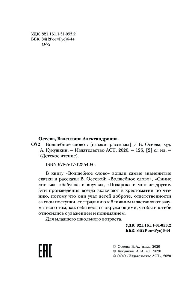 💳 Оплатить за товар можно при получении 🇰🇿 Есть бесплатная доставка по Казахстану от 1 дня 🎁 Копите бонусы с каждой покупки Серия: Детское чтение В книгу «Волшебное слово» вошли самые знаменитые сказки и рассказы В. Осеевой: «Волшебное слово», «Синие листья», «Бабушка и внучка», «Подарок» и многие другие. Эти произведения всегда включают в хрестоматии по чтению, потому что они учат детей доброте, ответственности за свои поступки, состраданию к ближним и заставляют задуматься о том, как себя вести с окружающими, чтобы и к тебе относились с уважением и пониманием. |