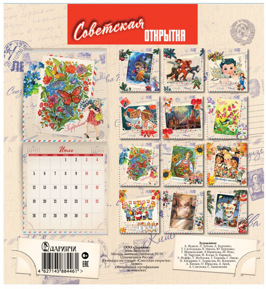 Даринчи Календарь настенный «Советская открытка»В данный момент этот товар отсутствует в продаже. Возможно, у нас найдется аналогичный или похожий товар здесь. Красочный и прекрасно иллюстрированный календарь призван украсить интерьер вашего дома или рабочего места. Сетка календаря составлена с учетом потребностей делового человека: в ней отмечены государственные праздники и оставлено место для заметок на каждый день. А безупречные с точки зрения качества иллюстрации с яркими мотивирующими цитатами будут радовать вас весь год! |