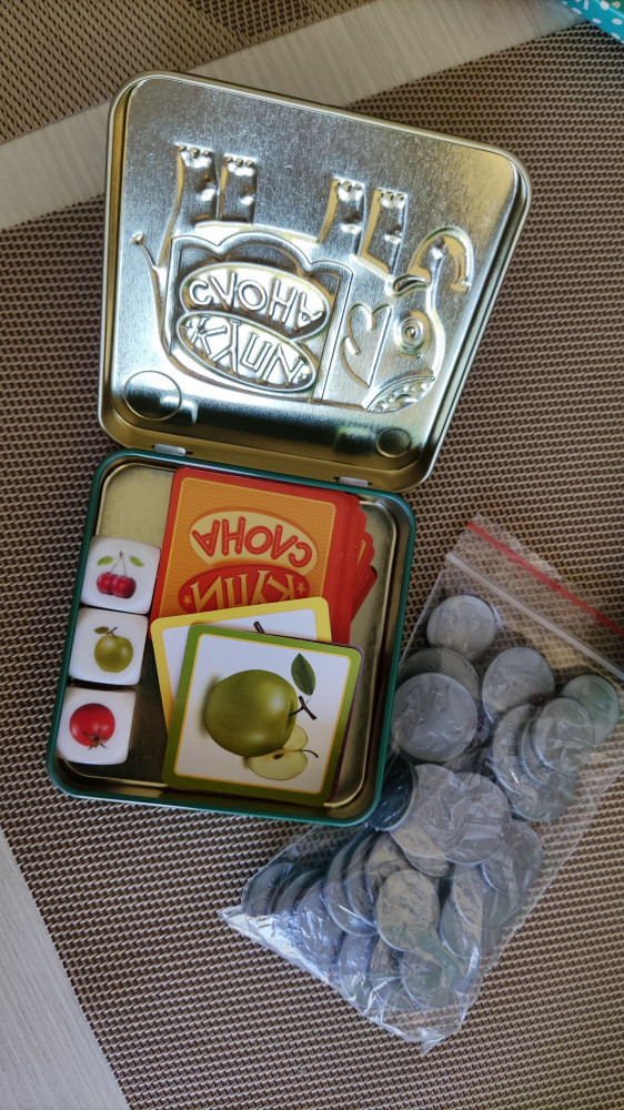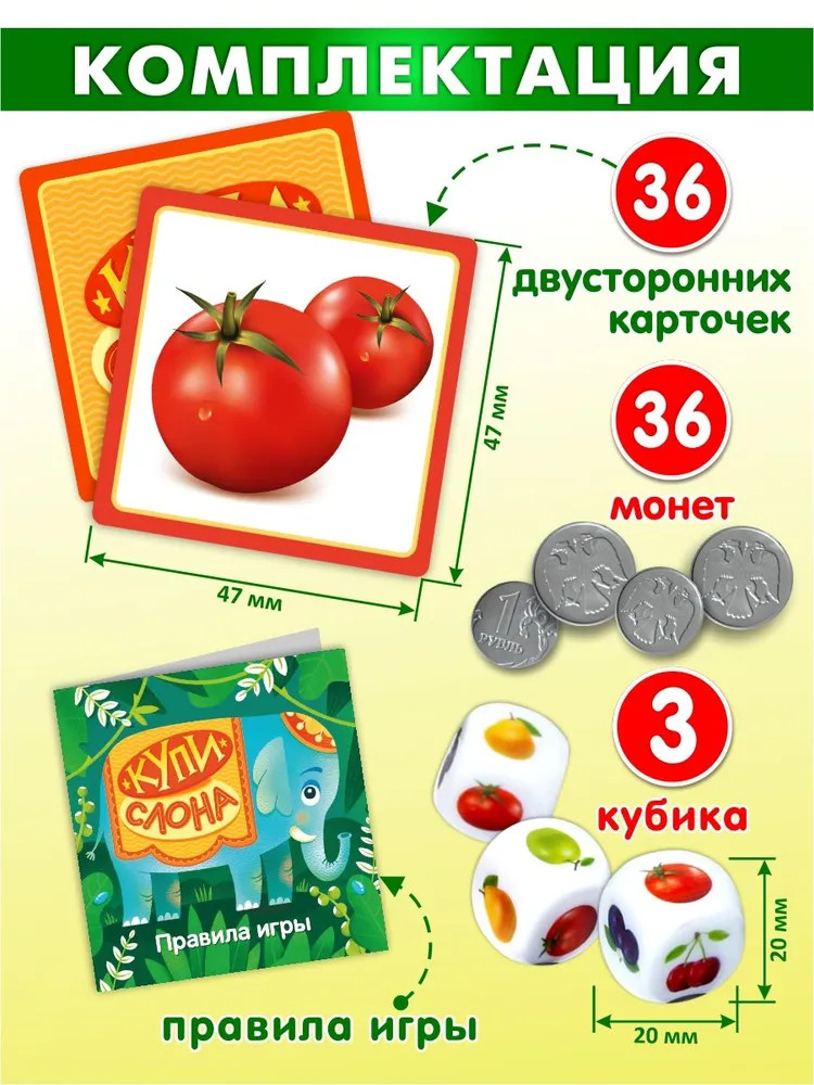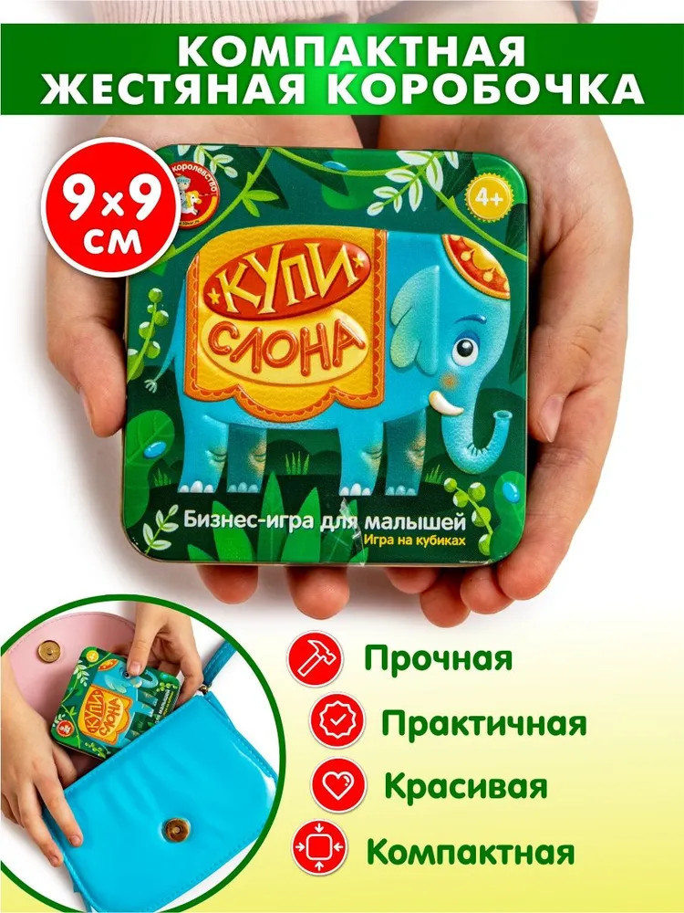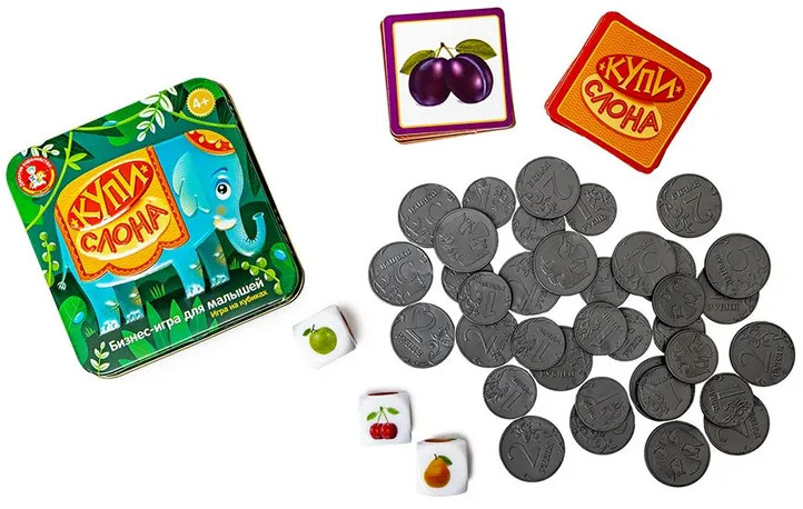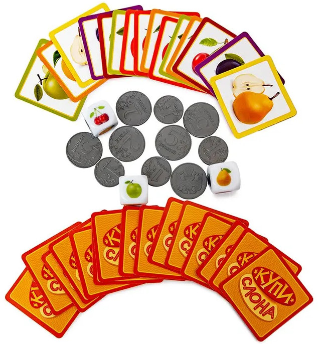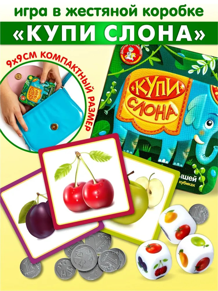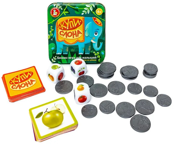 Игра логическая «Купи слона» в небольшой металлической коробочке. В коробочке находятся 3 кубика, кстати, хорошего размера, с яркими изображениями овощей и фруктов. Кубики очень красивые и приятные для рук. Карточки с рисунками "продаваемого товара" небольшие квадратные, но этого размера вполне достаточно. Карточки из тонкого, но ламинированного картона. Имеется достаточно понятные правила игры. Монеты разного достоинства, что позволяет торговать согласно заявленным ценам. Игра отлично выполнена, единственный минус - коробочка маловата для такого содержимого. Поэтому закрыть коробочку затруднительно (хотя мы, но всё же после нескольких попыток, закрываем). Игра очень интересная и красивая!