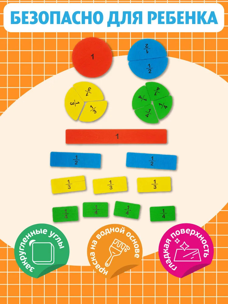 Качественно выполнены, красочные. Лучшее наглядное пособие для детей в понимании такой сложной темы как дроби. Довольны очень.