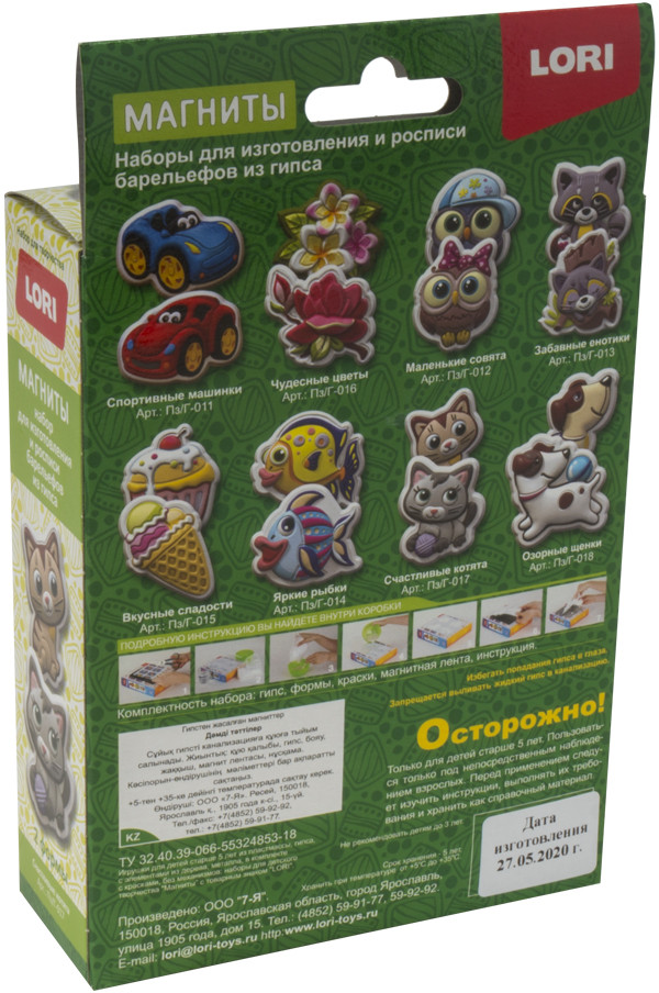 Lori Магниты из гипса «Счастливые котята»В данный момент этот товар отсутствует в продаже. Возможно, у нас найдется аналогичный или похожий товар здесь. Удивительный набор для детского творчества от бренда Lori позволит мальчикам и девочкам интересно провести досуг, самостоятельно создав из гипса различные фигурки. В технологическом плане процесс изготовления барельефа несложен. После отлива фигурок в специальных формочках, необходимо раскрасить а затем прикрепить к холодильнику или любой металлической поверхности. |