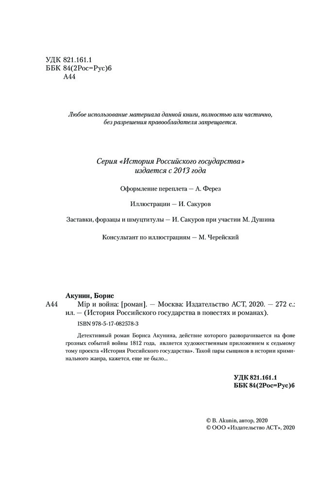 Мiр и ВойнаВ данный момент этот товар отсутствует в продаже. Возможно, у нас найдется аналогичный или похожий товар здесь. Серия: История Российского Государства (подарочная) Детективный роман Бориса Акунина, действие которого разворачивается на фоне грозных событий войны 1812 года, является художественным приложением к седьмому тому проекта «История Российского государства». Такой пары сыщиков в истории криминального жанра, кажется, еще не было... |