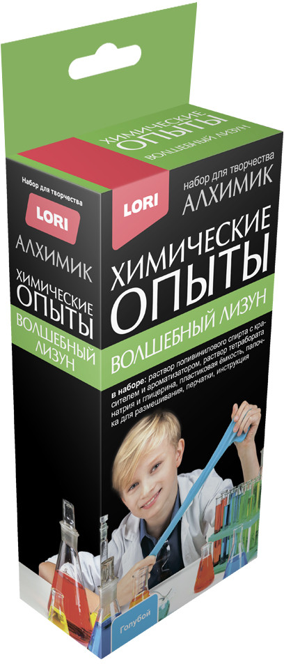 В комплектации: раствор поливинилового спирта с красителем и ароматизатором, раствор тетрабората натрия и глицерина, пластиковая емкость, палочка для размешивания, перчатки, инструкция.