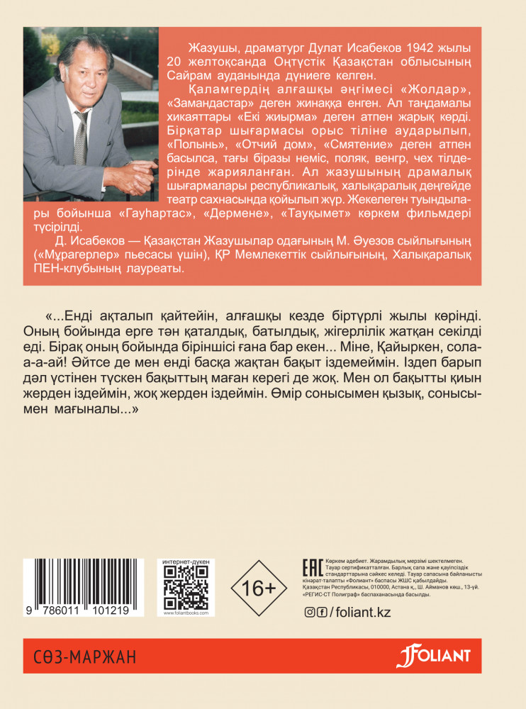 💳 Оплатить за товар можно при получении 🇰🇿 Есть бесплатная доставка по Казахстану от 1 дня 🎁 Копите бонусы с каждой покупки Дулат Исабековтың бұл повесі қазақтың халық әнімен аттас. Бірақ аты ғана ұқсамайды, бар болмысымен, сарынымен де салған әнге ұқсайды. Бір-біріне қарама-қайшы мінездердің бір шаңырақ астына жиналуынан пайда болған жағдаяттар баяндалып, сол аралықтағы көңілдер, сыртқа шыққан-шықпаған сезімдер бірте-бірте шашақталып, оқырман назарына ақырын-ақырын ілініп, тек соңында ғана толығымен айқара ашылады. Кітап жасөспірімдер мен ересектерге арналады. |