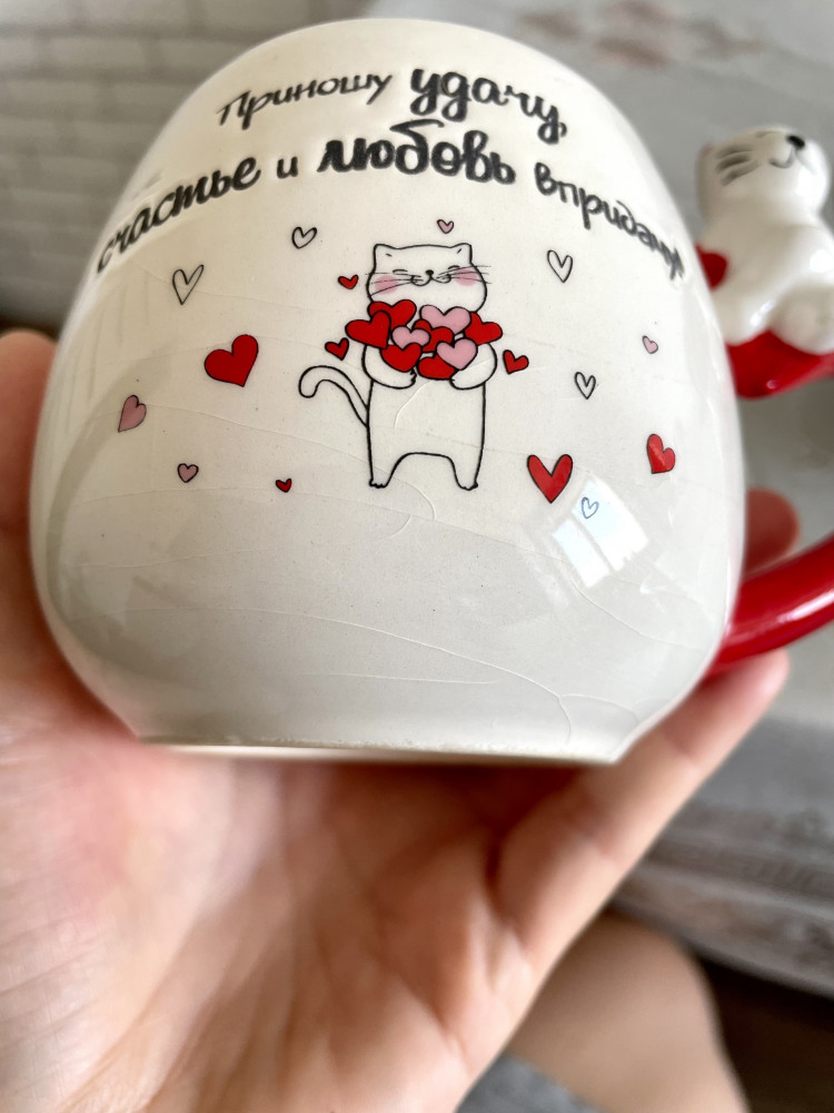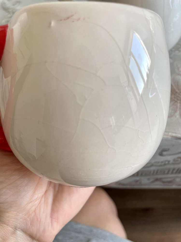 Симпатичная оригинальная кружечка. На первый взгляд нет претензий. Однако опечалило то, что когда наливаешь горячий чай (не крутой кипяток), трескается наружное покрытие. Внутри все целое, только снаружи. Взяла две разные кружки и у обеих такая история.
