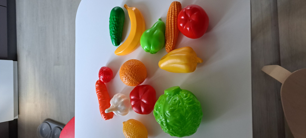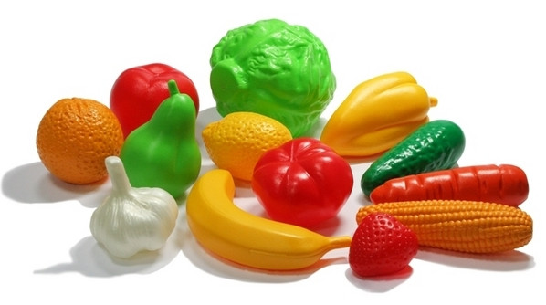 хороший набор, прочный пластик, размер фруктов - ок. Единственный минус - помидор с яблоком похожи, хотелось бы немного больше детализации