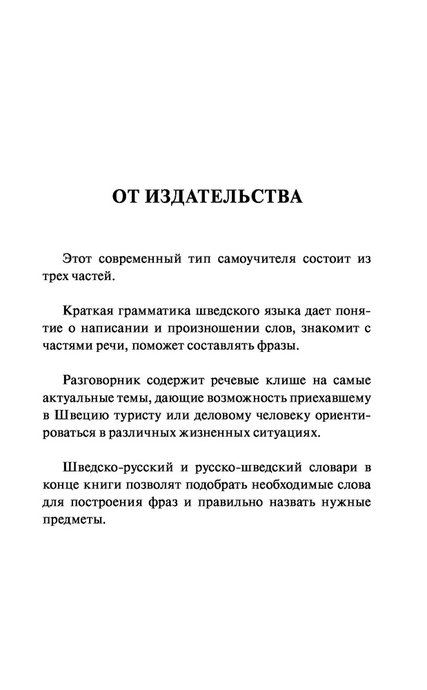 💳 Оплатить за товар можно при получении 🇰🇿 Есть бесплатная доставка по Казахстану от 1 дня 🎁 Копите бонусы с каждой покупки Серия: Иностранный за 30 дней «Шведский за 30 дней» — это отличный помощник для тех, кто хочет выучить шведский легко и быстро. Самоучитель состоит из трех частей. Краткая грамматика знакомит с особенностями шведского письма, произношения и частями речи. Разговорник содержит самые необходимые слова и фразы для свободного общения. Шведско-русский и русско-шведский словари помогут расширить словарный запас. |