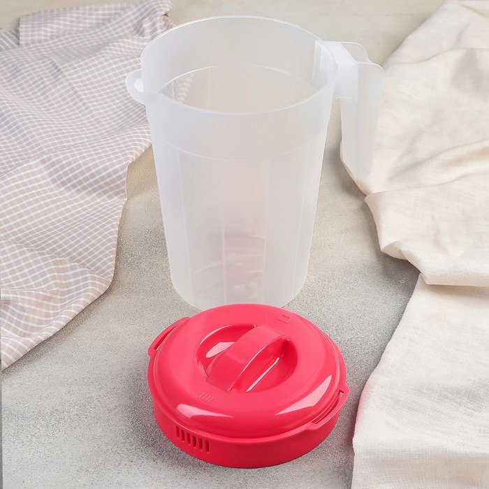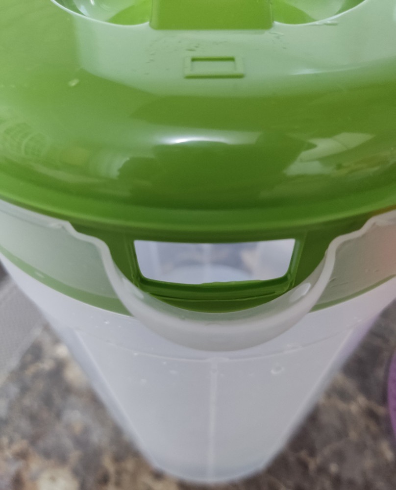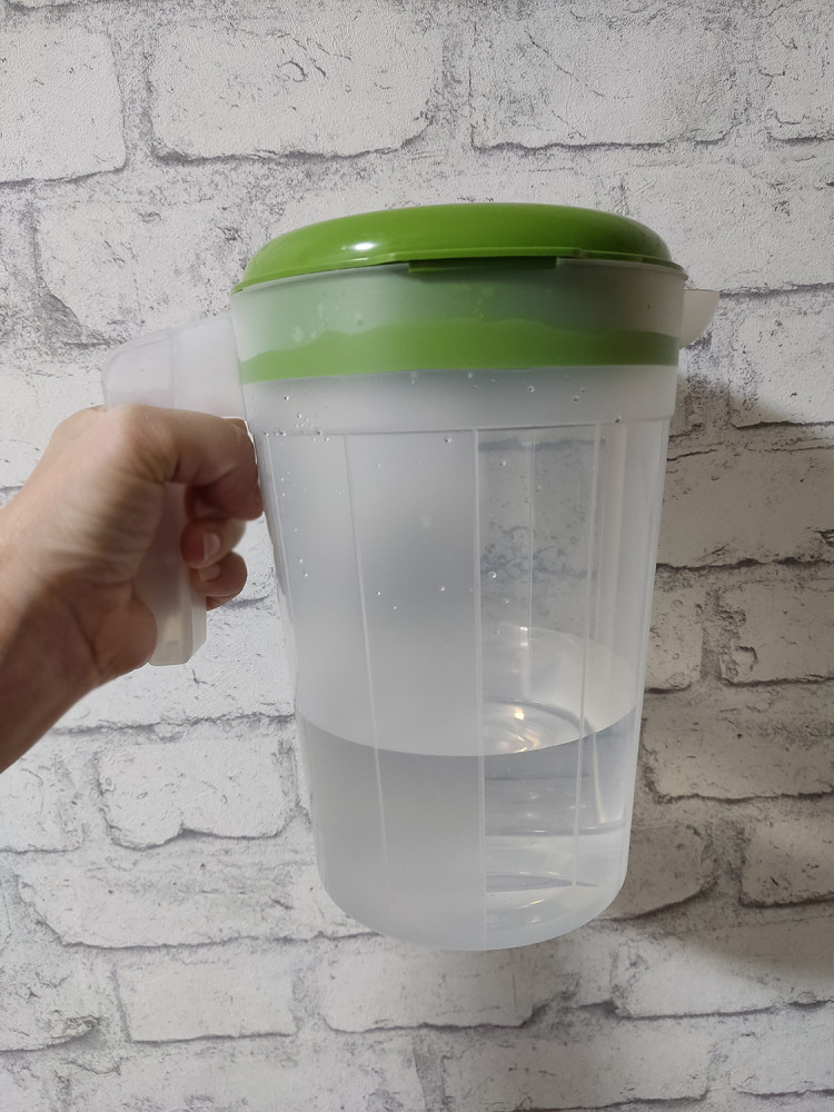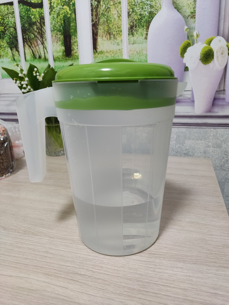 Кувшин хороший. Крышка фиксируется, выпадать не будет. Также крышку можно поворачивать двумя сторонами. С одной стороны просто дырка, а с другой, что-то вроде решеточки, чтобы задерживать ягоды, фрукты при необходимости. Лёгкий. Не очень понравилась ручка, какая-то угловатая и не совсем удобная. Но это субъективно и дело привычки. Запаха пластика не было совсем.