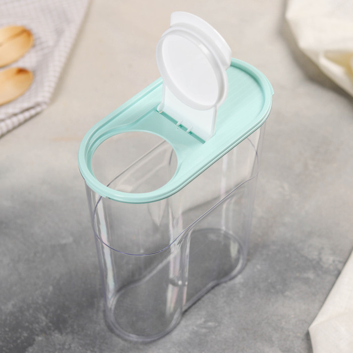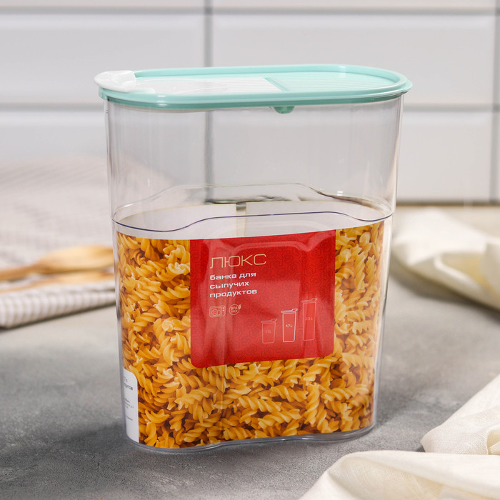 Банка для сыпучих продуктов изготовлена из пластика. Имеет плотно закрывающуюся крышку, которая защищает еду от влаги и посторонних запахов. В ёмкости удобно хранить крупы, специи, макаронные изделия, сахар, муку и бобовые.