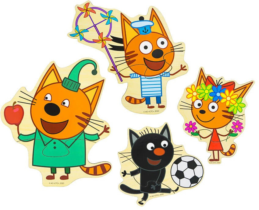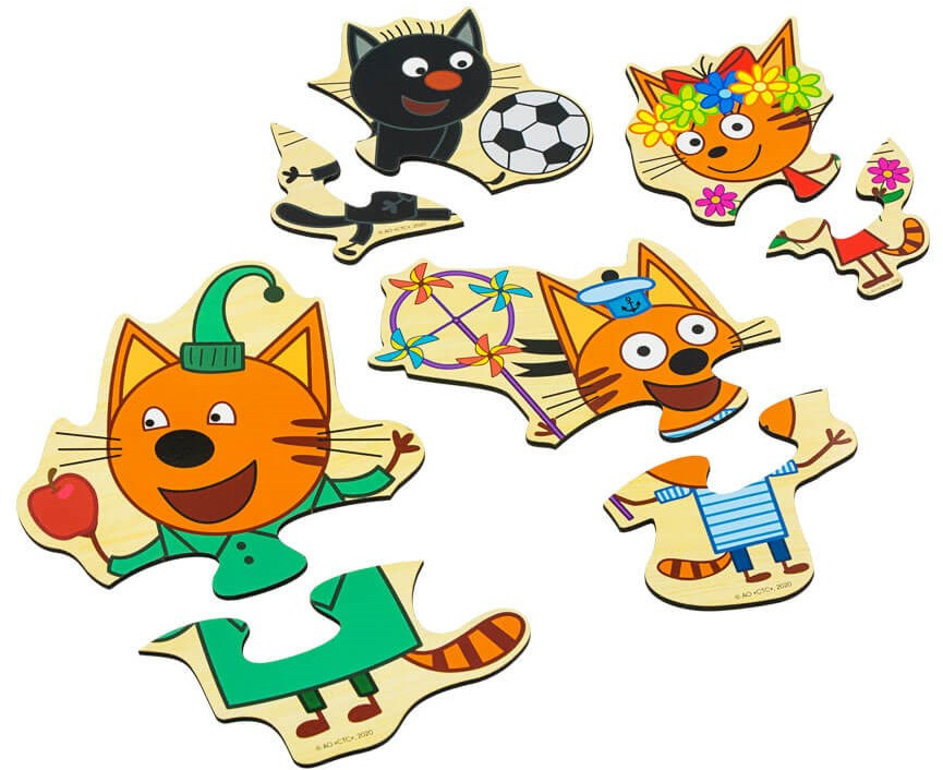 Пазлы — популярная развивающая игрушка. Набор деревянных пазлов от «Алатойс» состоит из четырех фигур любимых героев мультфильма «Три кота», поделенных на две части. Задача для ребёнка — собрать героя, применяя логику и мелкую моторику. Пазлы от «Алатойс» яркие, качественные и привлекательные для малышей.