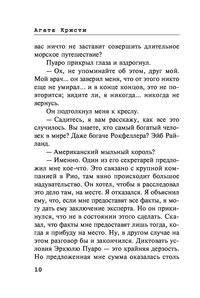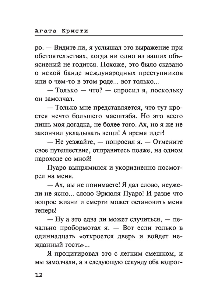 у меня нет причины говорит об этой книге плохо.Ведь это книга Агаты Кристи. Я могу лишь только сказать, что читая эту книгу я как будто смотрела фильм.И не простой фильм,а боевой.Я удивлена настолько насколько это возможно,чтобы человек смог такое написать,да так чтобы читатель ощутил себя как в кино...это что-то с чем-то. Восхищаюсь книгой больше когда вспоминаю, что все это писала Женщина!Книга гениальная и очень даже интересная.Агата никогда не заставляет унывать от её книг!