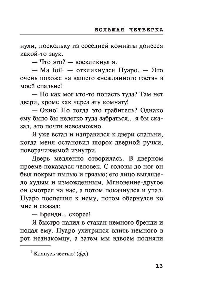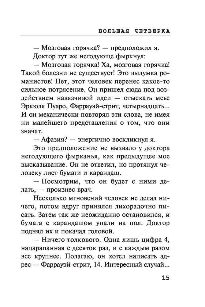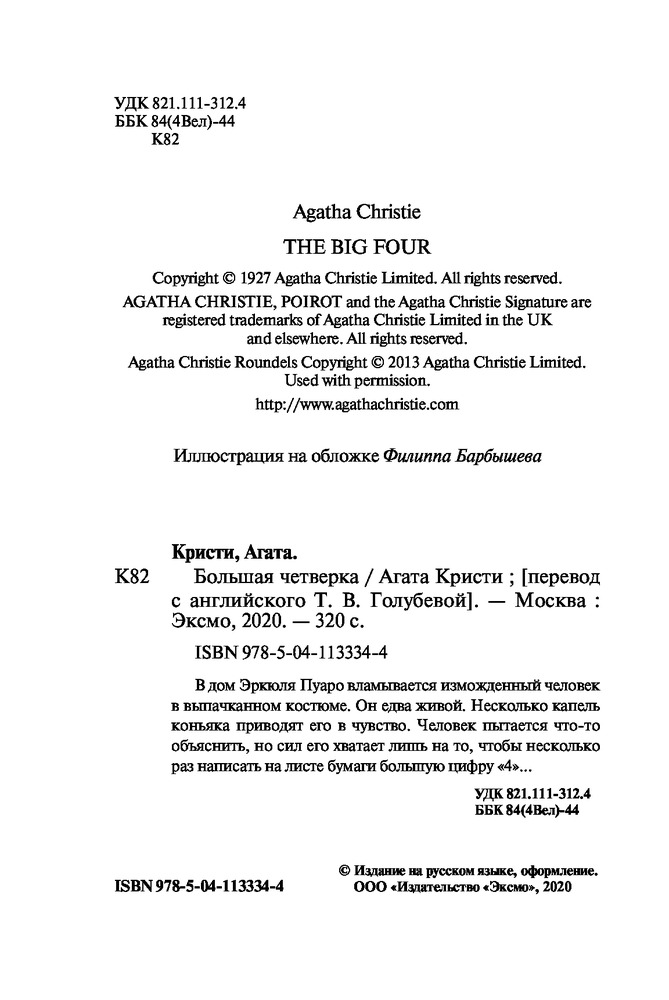 💳 Оплатить за товар можно при получении 🇰🇿 Есть бесплатная доставка по Казахстану 🎁 Копите бонусы с каждой покупки Серия: Агата Кристи. Любимая коллекция В дом Эркюля Пуаро вламывается изможденный человек в выпачканном костюме. Он едва живой. Несколько капель коньяка приводят его в чувство. Человек пытается что-то объяснить, но сил его хватает лишь на то, чтобы несколько раз написать на листе бумаги большую цифру «4»... |