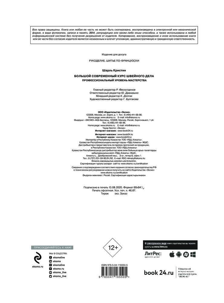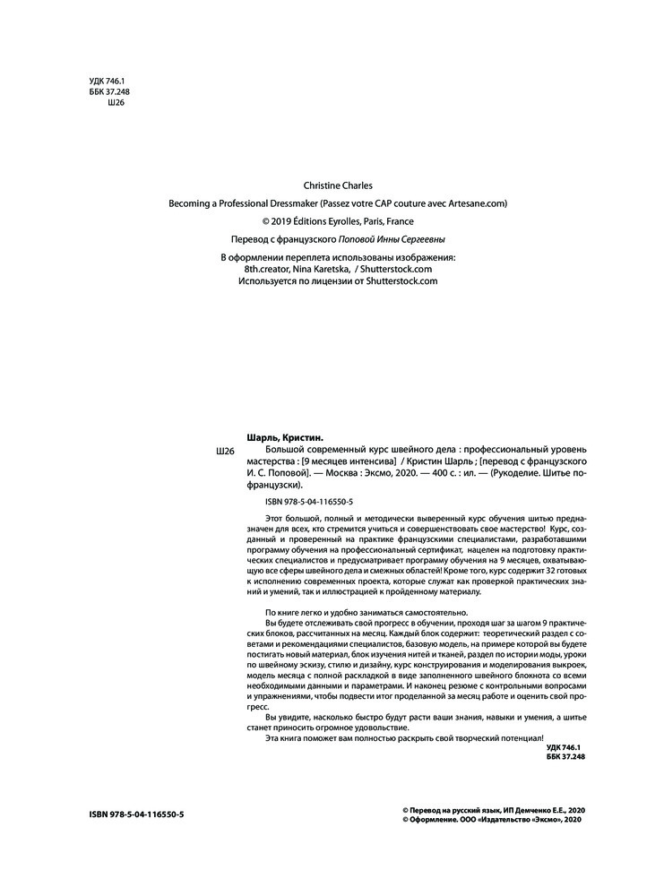 В данный момент этот товар отсутствует в продаже. Возможно, у нас найдется аналогичный или похожий товар здесь. Серия: Рукоделие. Шитье по-французки Этот большой, полный и методически выверенный курс обучения шитью предназначен для всех, кто стремится учиться и совершенствовать свое мастерство! Курс, созданный и проверенный на практике французскими специалистами, разработавшими программу обучения на профессиональный сертификат, нацелен на подготовку практических специалистов и предусматривает программу обучения на 9 месяцев, охватывающую все сферы швейного дела и смежных областей! Кроме того, курс содержит 32 готовых к исполнению современных проекта, которые служат как проверкой практических знаний и умений, так и иллюстрацией к пройденному материалу.