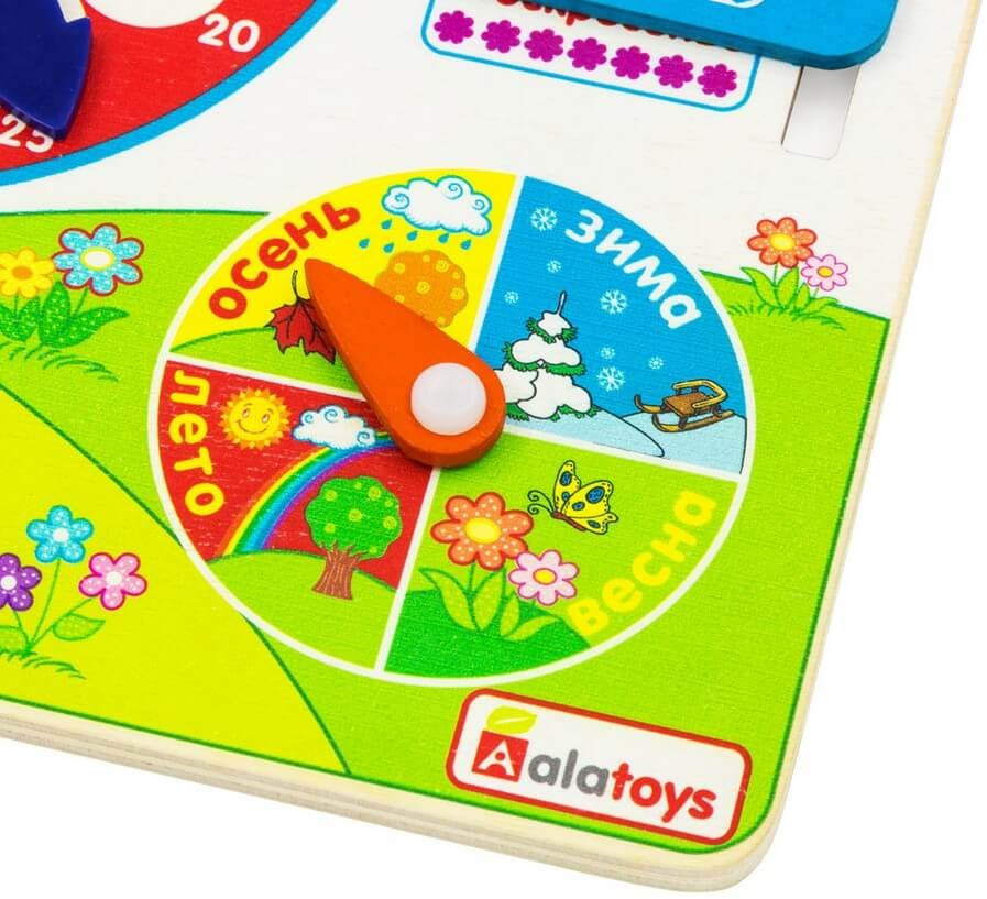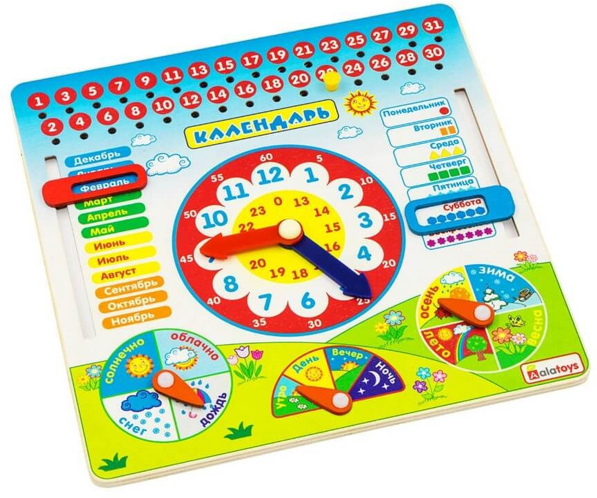 Alatoys Бизиборд «Календарь»В данный момент этот товар отсутствует в продаже. Возможно, у нас найдется аналогичный или похожий товар здесь. «Детский Календарь» — с ним ребенок сможет как самостоятельно, так и с помощью взрослых, погрузиться в серьезный мир подсчетов и описания погодных условий, разберется с цветовой палитрой радуги, запомнит и поймет принцип работы часовой и минутной стрелок. Также он познакомится с календарем, изучит времена года и время суток. |