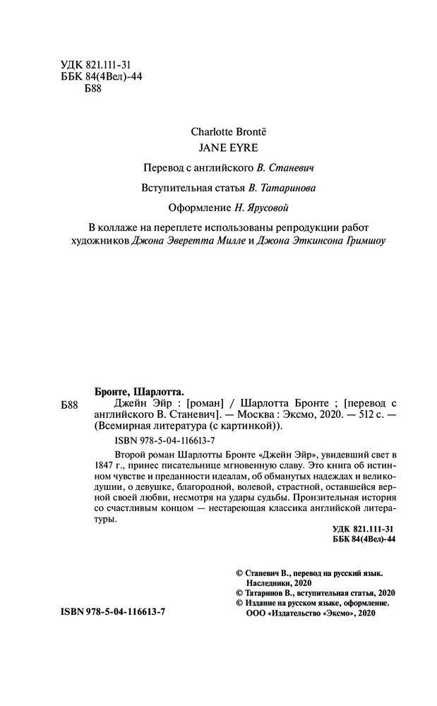 Джейн ЭйрВ данный момент этот товар отсутствует в продаже. Возможно, у нас найдется аналогичный или похожий товар здесь. Серия: Всемирная литература (новое оформление) Второй роман Шарлотты Бронте «Джейн Эйр», увидевший свет в 1847 г., принес писательнице мгновенную славу. Это книга об истинном чувстве и преданности идеалам, об обманутых надеждах и великодушии, о девушке, благородной, волевой, страстной, оставшейся верной своей любви, несмотря на удары судьбы. Пронзительная история со счастливым концом — нестареющая классика английской литературы. |