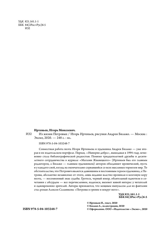 Из жизни ПетровыхВ данный момент этот товар отсутствует в продаже. Возможно, у нас найдется аналогичный или похожий товар здесь. Серия: Интеллектуальное хулиганство с иллюстрациями Андрея Бильжо Совместная работа поэта Игоря Иртеньева и художника Андрея Бильжо — уже вторая в их издательском портфеле. Первая, «Империя добра», вышедшая в 1994 году, мгновенно стала библиографической редкостью. Помимо тридцатилетней дружбы и десятилетнего сотрудничества в журнале «Магазин Жванецкого» (Иртеньев был его главным редактором, а Бильжо главным художником — авторов объединяет иронический, пусть и у каждого свой, взгляд на окончательно сорвавшийся со всех мыслимых тормозов мир. То обстоятельство, что Петрович является давнишним и постоянным героем художника, а Петровы, абсолютно независимо от этого, лишь недавно властно проникли в мозговую кору поэта, — несомненный знак судьбы. Гротеск, черный юмор, обаятельный идиотизм в сочетании с абсурдом — все перечисленное, надеемся, вызовет живой интерес у читателей и одновременно зрителей. Авторы признаются, что мощным импульсом для их фантазии стал роман Алексея Сальникова "Петровы в гриппе и вокруг него«.Помимо тридцатилетней дружбы и десятилетнего сотрудничества в журнале «Магазин Жванецкого» Игоря Иртеньева и Андрея Бильжо объединяет иронический, пусть и у каждого свой, взгляд на окончательно сорвавшийся со всех мыслимых тормозов мир. В новой книге-альбоме, вдохновленной книгой Алексея Сальникова «Петровы в гриппе и вокруг него», смешное соседствует с серьезным, а серьезное — с философским. И Петрович, давно полюбившийся читателям Бильжо, выступает в новом амплуа... |